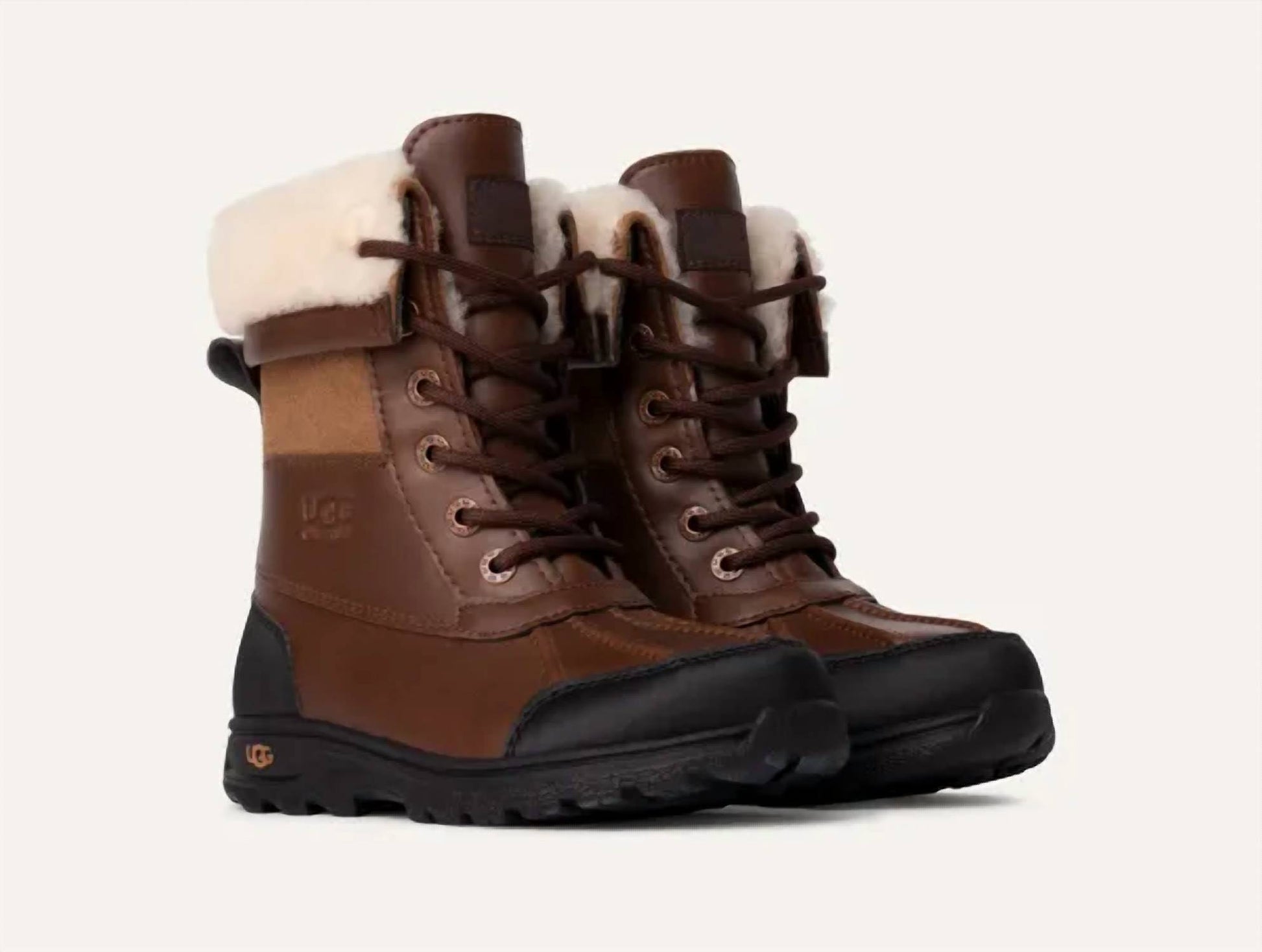 Built for the cold, this classic winter boot can withstand temperatures as low as -20?C and looks good with everything from school to ski clothes. The Butte II combines waterproof construction with soft wool lining and extra insulation to keep feet warm in any weather. Pair with our adult-sized Butte Boot for a cute little mini-me look. Item No. 1098890K Waterproof Waterproof membrane bootie construction Waterproof leather Waterproof suede Gusseted tongue with water repellent coating Polyester laces 10mm UGGplush™ 80% upcycled wool, 20% lyocell lining or 10mm UGGplush™ 60% upcycled wool, 40% lyocell lining 7mm Curly UGGplush™ 80% upcycled wool, 20% lyocell insole or 7mm Curly UGGplush™ 60% upcycled wool, 40% lyocell insole Foam footbed Durable rubber outsole 6" shaft height Weather Rated -20?C Heat-embossed UGG® logo Best for: Casual, Heavy rain, Heavy snow