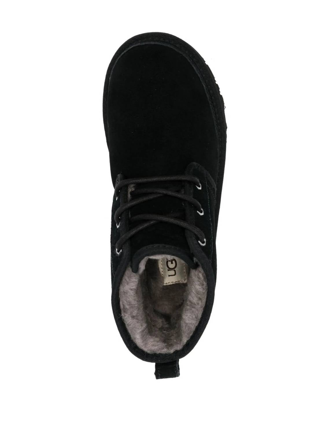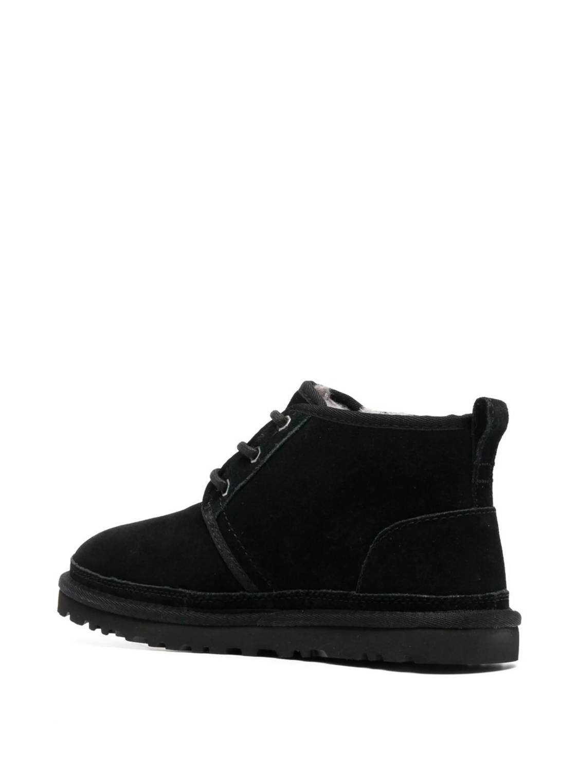 Step out in style with the Men's Neumel Lace Up Desert Boots by UGG. Crafted from 100% calf suede with a durable rubber lug sole, these boots offer both elegance and practicality. They feature a round toe, front lace-up fastening, and a convenient pull-tab at the heel. The lining is composed of 100% recycled polyester, 80% wool, and 20% lyocell, promising comfort and warmth. With a subtle heel height of 2.5 cm and a sole height of 1.5 cm, these flat-heeled boots maintain a minimalist charm in a sleek black hue.