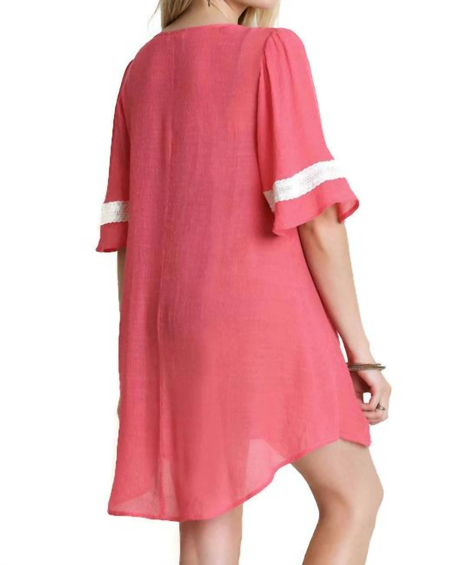 A short and breezy dress for those warmer days. Meet the Bohemian Lace Short Dress in Coral by Umgee, the perfect addition to your summer wardrobe. This mini dress features elbow-length bell sleeves and a chic split V-neck with tie detailing. Crafted from a cotton blend of 60% cotton and 40% polyester, it boasts a high-low hemline and lace detailing. This pull-on style is imported and should be hand washed in cold water, making it ideal for vacation wear. Available in a size Small with a bust measurement of 38" and a length of 32".