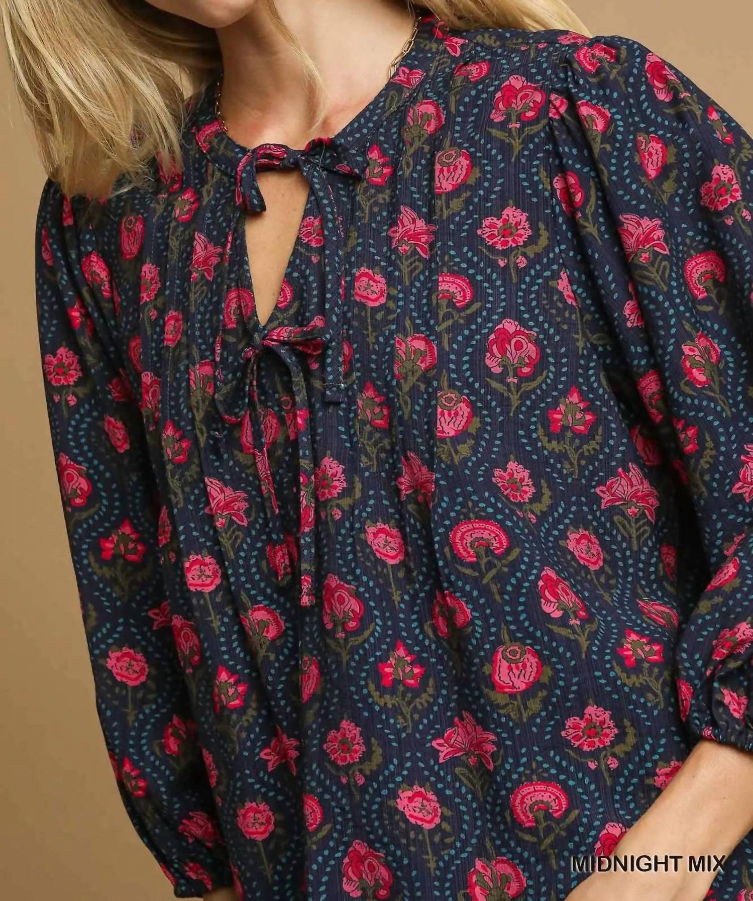 A versatile blouse that works from desk to dinner! Embrace a fresh and playful vibe with the Umgee Mix Floral Pintuck Top, a delightful addition to your spring wardrobe. This women's blouse features three-quarter sleeves crafted from 80% Rayon, 20% Nylon, offering a lightweight feel perfect for the season. The eye-catching multi-color floral pattern is complemented by a V-neckline that plunges into a charming keyhole detail. Designed with a tie closure for added flair, this top is machine washable and should be line dried to maintain its breezy, bohemian charm. Ideal for a holiday party or Easter gathering, it exudes effortless style and charm.