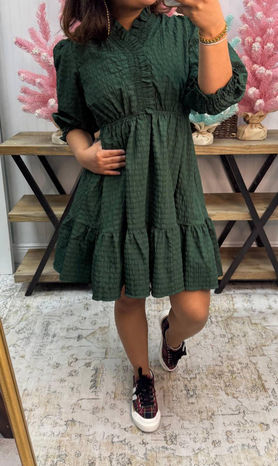 The kind of easy and flattering dress you'll be reaching for all season long. The Ruffled Trim Textured Baby Doll Mini Dress by Umgee in Emerald Green is a captivating addition to your fall wardrobe. Designed with long smocked sleeves, this fit and flare mini dress is made from textured 100% Polyester, exemplifying quiet luxury for any cocktail party or holiday gathering like Thanksgiving. The dress features a charming V-neckline and a pull-on closure for effortless styling. For care, machine wash and line dry to maintain its delightful form.