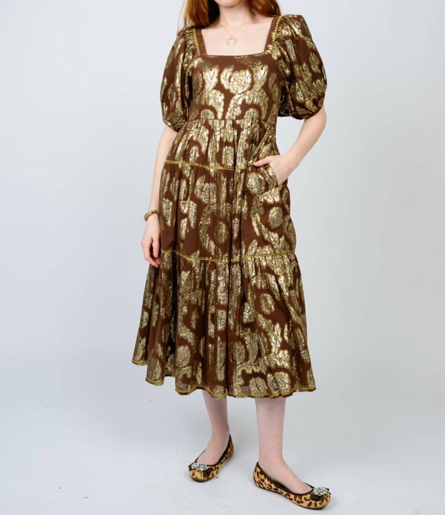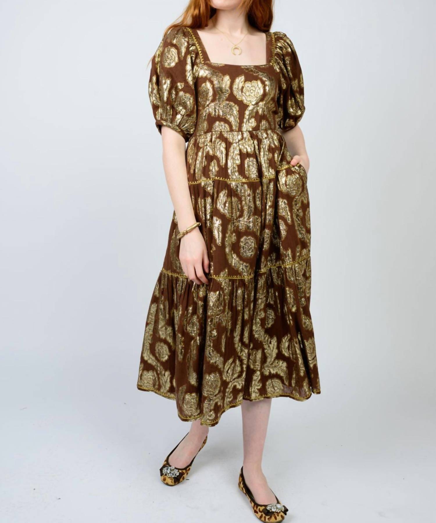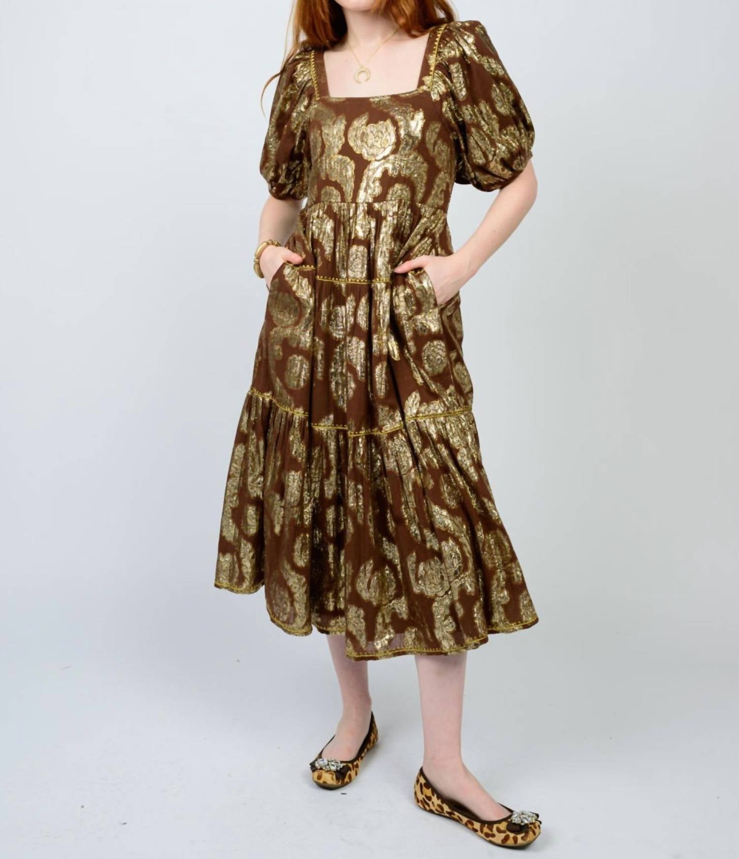 A midi dress so versatile, your options for wearing it are endless. Uncle Frank's Charlotte Midi Dress is a captivating piece perfect for your cocktail party collection. This A-line dress in a charming brown cotton blend features a beautiful gold floral print and short puff sleeves, exuding quiet luxury. With a convenient pull-on closure and a flattering square neckline, it also includes pockets for practicality. Care: Dry clean only.