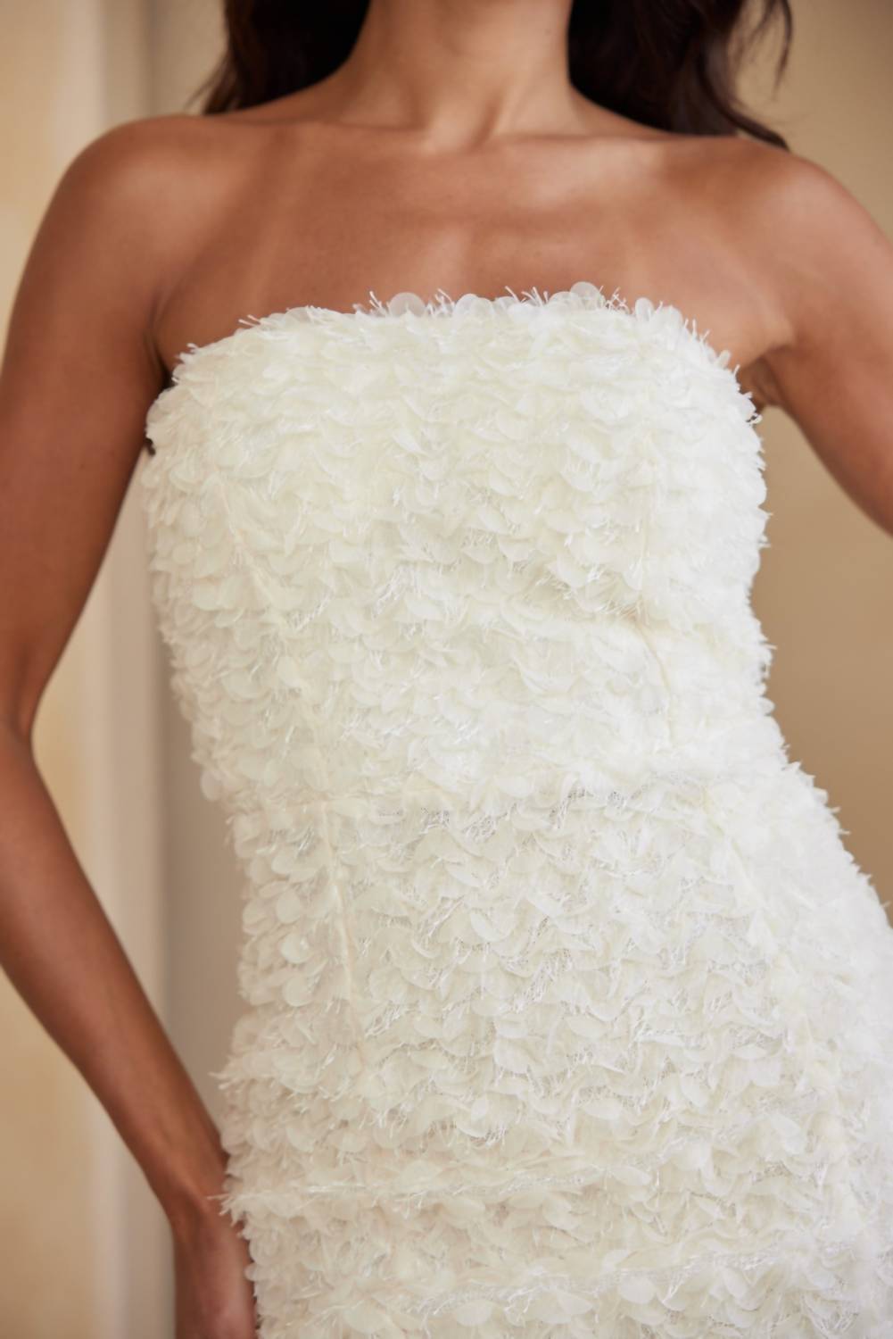 A short and breezy dress for those warmer days. Indulge in the sophisticated elegance of the Fall In Love Dress by Valentine, crafted for discerning tastes. This strapless mini dress boasts a textured 3D fuzz effect, creating a visually stunning appearance perfect for cocktail parties. Made from semi-stretch 100% polyester, it features a back zipper closure for a seamless fit and is fully lined for added comfort. Care instructions emphasize dry cleaning to maintain its luxurious allure.