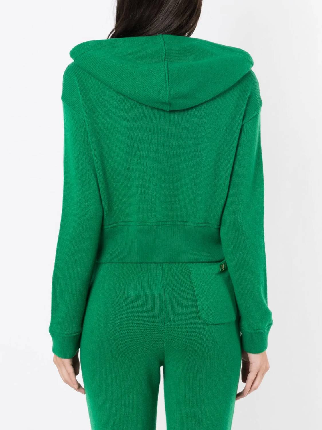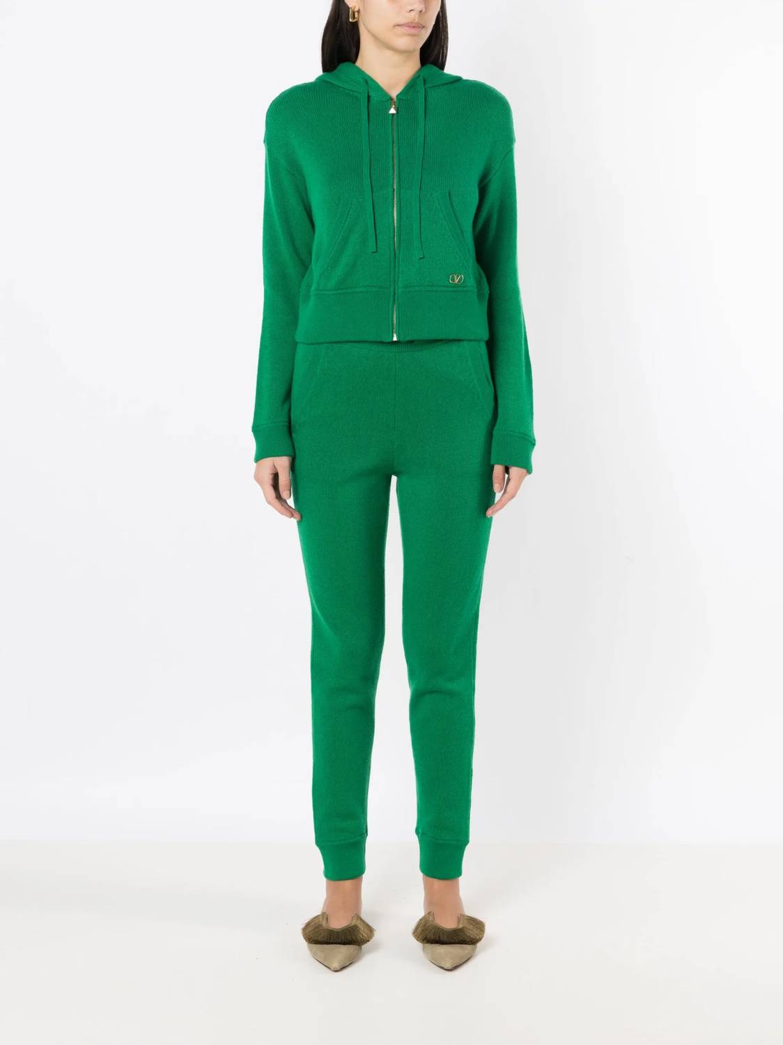 Cooler temps call for layering and we love this adorable sweatshirt for all the obvious reasons. Elevate your fall wardrobe with the Valentino Logo Shield Hoodie in an elegant Antic Green. This luxurious hoodie features a hooded neckline and long sleeves, crafted entirely from 100% cashmere for ultimate warmth and comfort. Designed in Italy, it boasts gold-tone hardware, an iconic V logo, a drawstring hood, and a practical front zip closure with a front pouch pocket for added convenience. Care instructions recommend machine wash. Model wears size S and is 1.74 m tall.