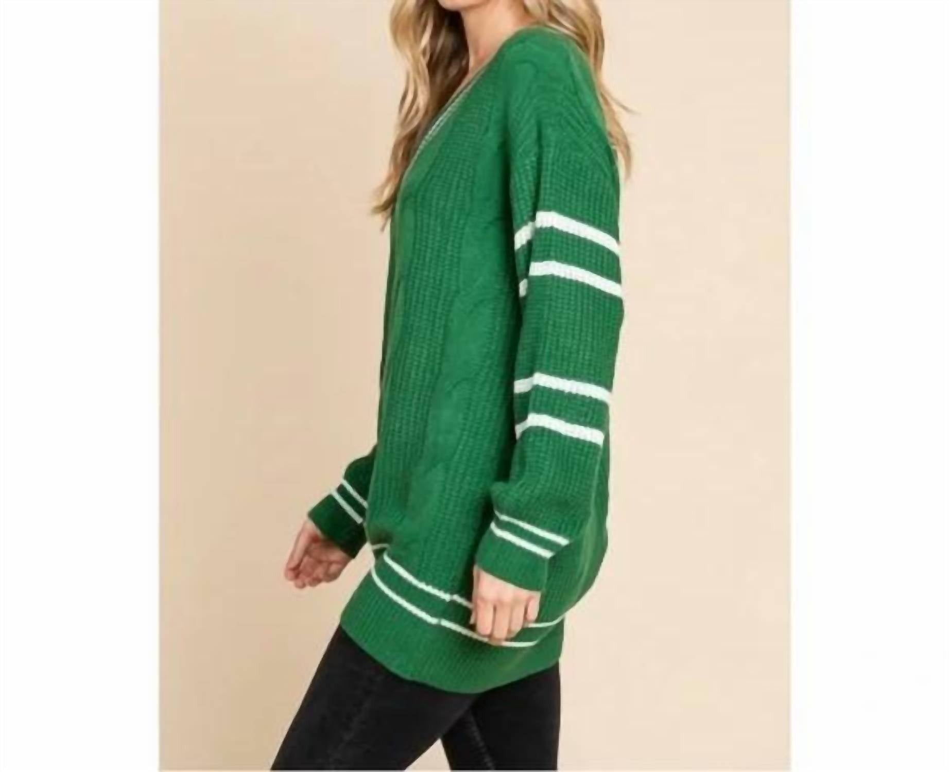 You'll be reaching for this comfy and classic v-neck sweater all season long. Introducing the Women's V Neck Striped Border Knit Sweater by Vanilla Bay, a perfect addition to your spring vacation wardrobe. This maximalist, long-sleeve sweater showcases a textured pattern in a vibrant green hue. Featuring a flattering V-neck, this stylish piece offers a chic pull-on design suitable for a variety of occasions. Ideal for women seeking comfort and flair without the fuss of special care instructions.