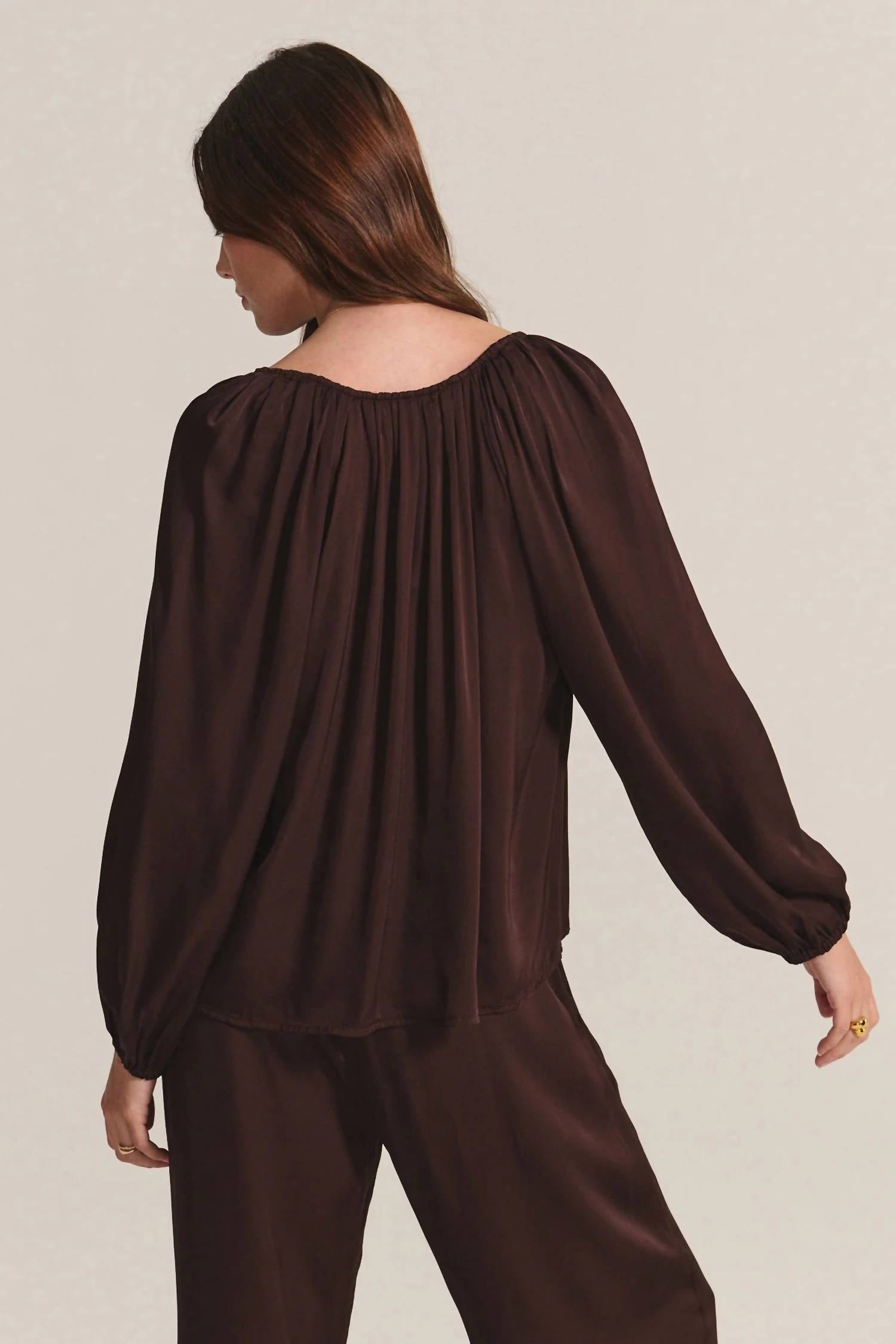 A versatile blouse that works from desk to dinner! Elevate your wardrobe with the Lyla Silk Velvet Satin Mix Media V-neck Blouse by Velvet by Graham & Spencer in the sophisticated Mulch shade. This stunning long sleeve blouse boasts a delicate composition of 82% Viscose and 18% Silk, with 100% Viscose, made with care in the USA. With a flattering V-neckline and subtle pleated detailing, it offers a luxurious drape and chic versatility. Closure: Pull on. For maintenance, simply machine wash and lay flat to dry.