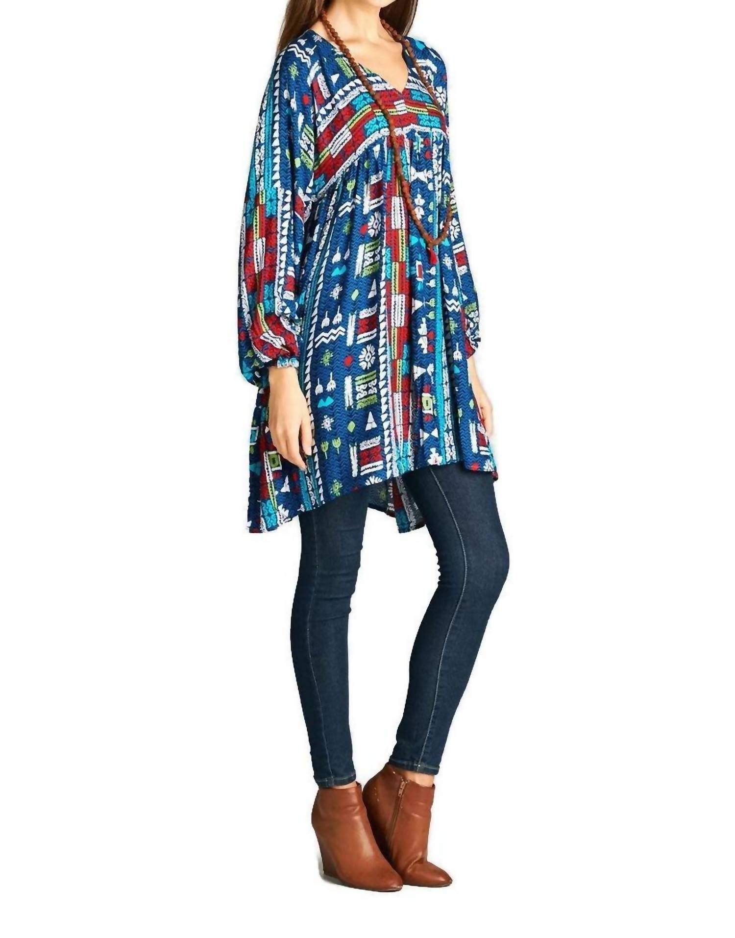 The kind of easy and flattering dress you'll be reaching for all season long. Elevate your wardrobe with the Velzera Geometric V-neck Mini Dress, a striking choice for any holiday party. Featuring long sleeves with elastic at the hem and a back keyhole detail, its A-line mini silhouette and high waist are both flattering and stylish. Made from 100% Rayon, this dress is a perfect blend of comfort and chic, with a geometric pattern in vibrant multi colors. Available in sizes ranging from Small (Bust 38", Length 33") to Large (Bust 42", Length 33").