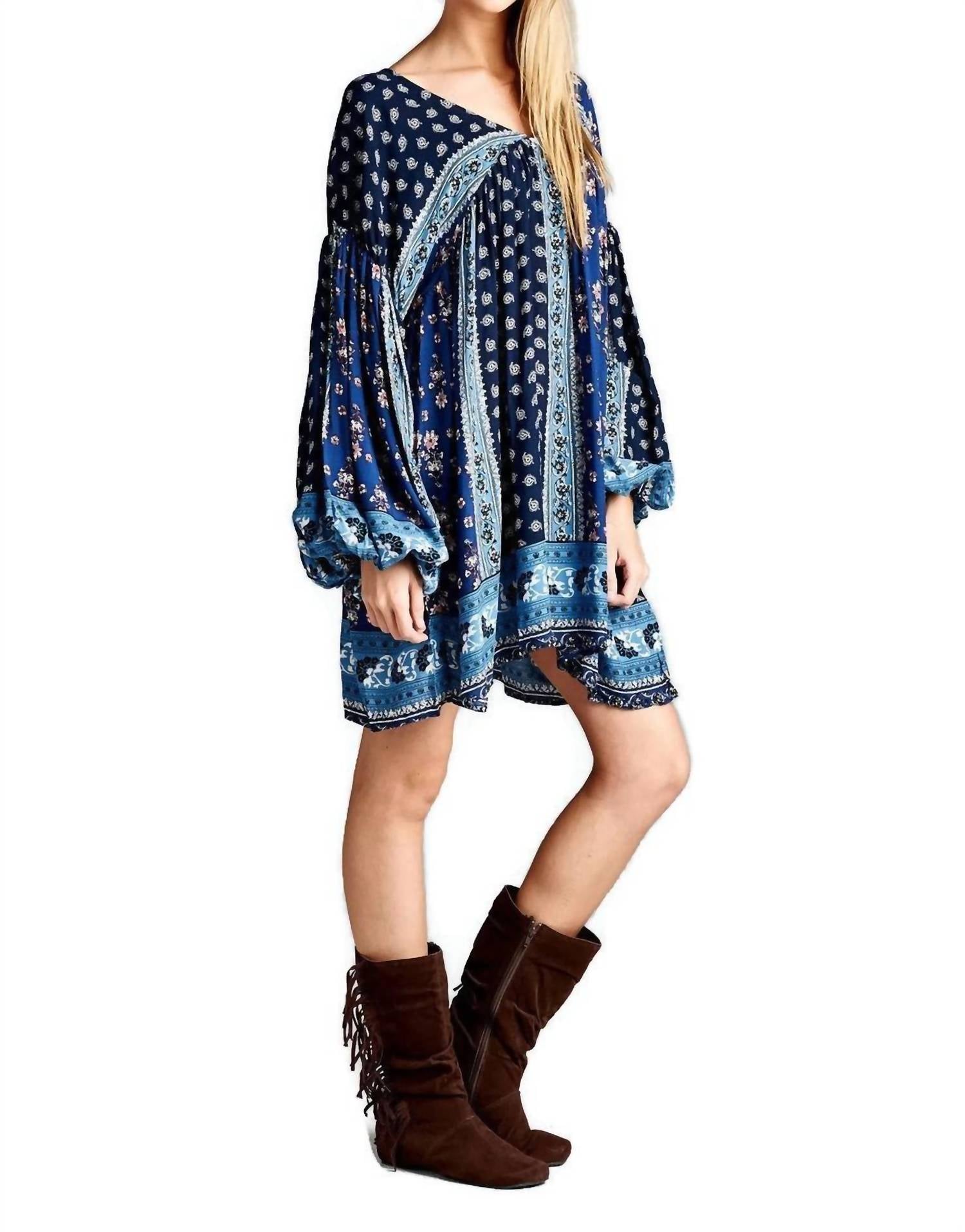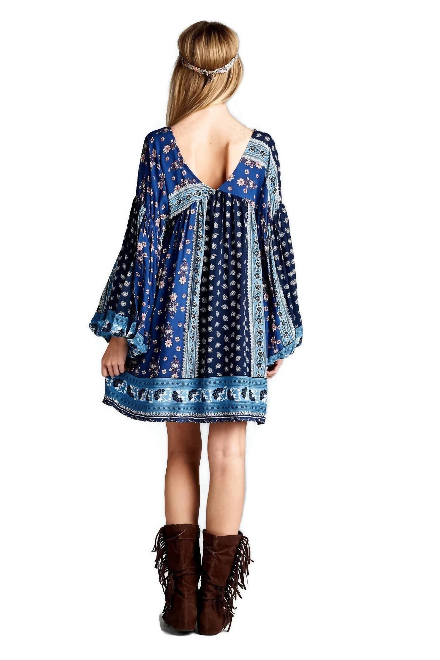 A short and breezy dress for those warmer days. Introducing the Patch Print Baby Doll Mini Dress by Velzera, a boho chic piece perfect for your spring vacation wardrobe. This women's dress showcases long pleated sleeves, a deep V-neckline front and back, and an A-line mini silhouette. Crafted from 100% rayon, it ensures a comfortable fit with a pull-on closure, highlighted in a lovely blue patterned design. Measurements: Small Bust 42", Medium Bust 44", Large Bust 46", all with a length of 32".