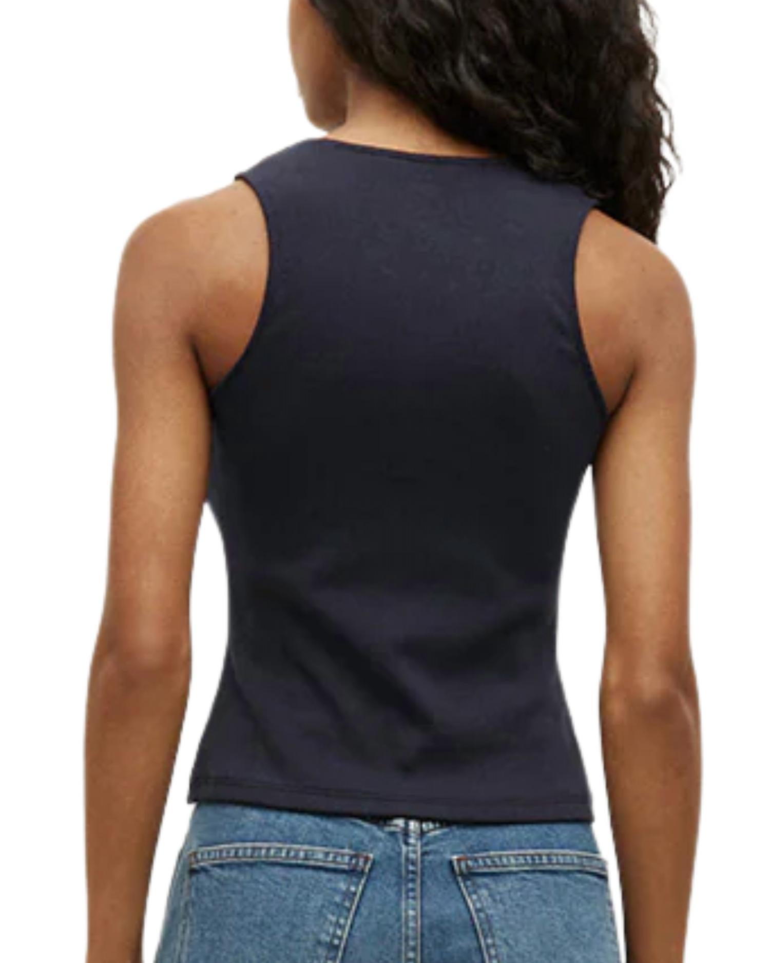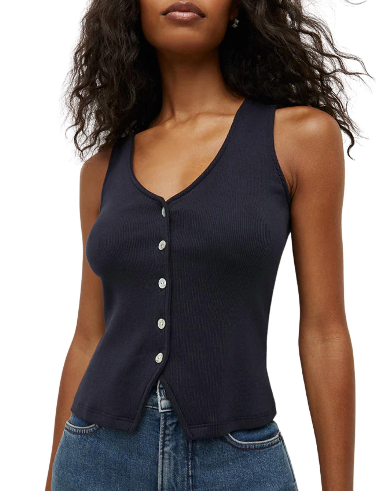 A versatile blouse that works from desk to dinner! The Hoorne Top by Veronica Beard is an elegant sleeveless vest in a rich navy hue, perfect for summer dinner parties. Crafted from a soft stretch cotton blend with 97% Cotton and 3% Elastane, this solid-patterned piece features a button closure, allover ribbing, and a fashionable v-neck with an angled cutaway hem. It's minimalist yet versatile, making it ideal for layering or wearing on its own. Care instructions include machine washing cold and line drying to maintain its sleek appearance.