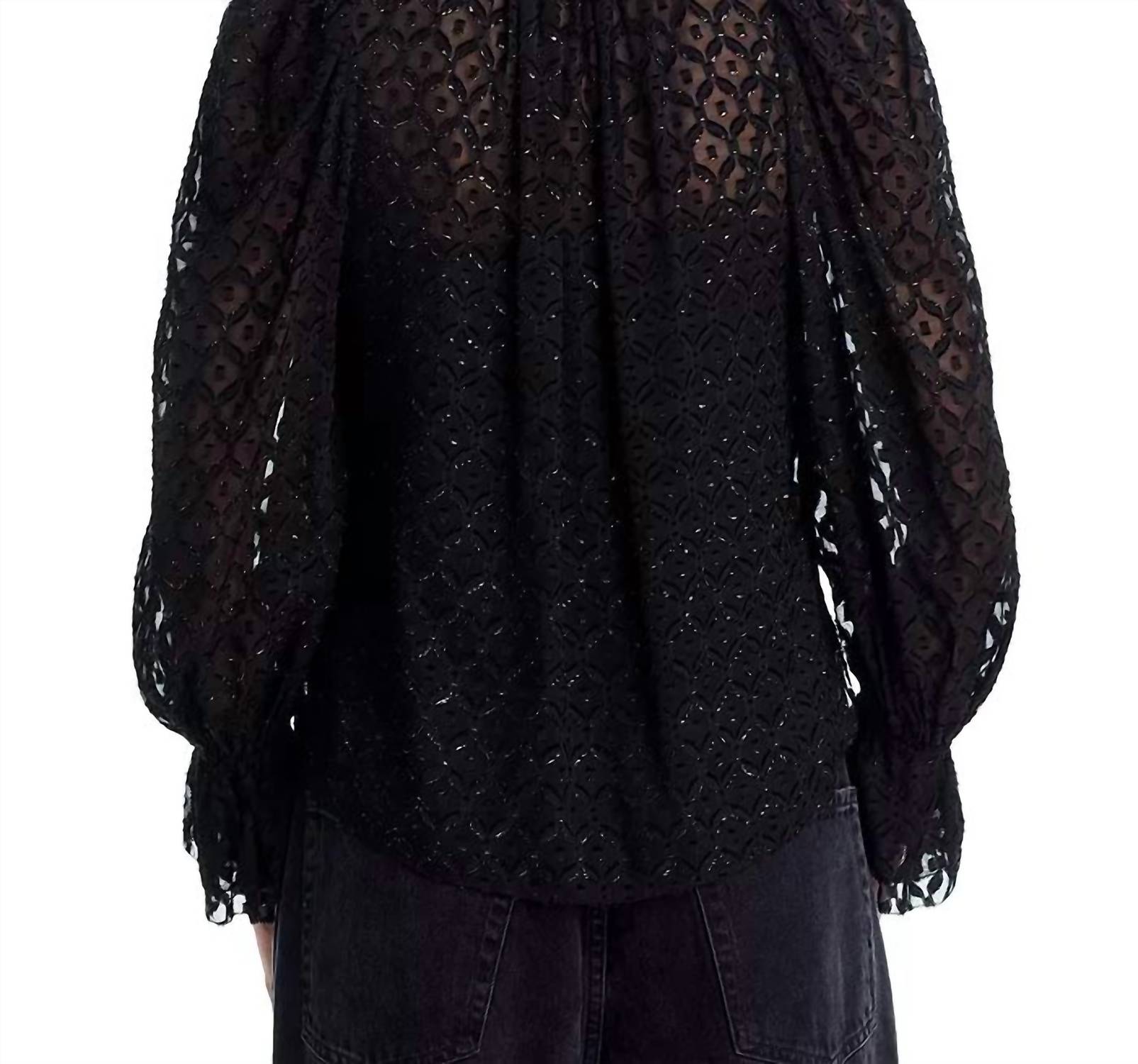 A timeless blouse that will never go out of style. The Maxime Lace Blouse by Veronica Beard exudes ethereal elegance with its black and gold hue and semi-sheer allure. This women’s blouse features long blouson sleeves with flared cuffs, crafted in a textured fil coupé finish from 100% viscose, with a lining made from 100% polyester. The garment boasts a roughly 24.75-inch length and a high neckline adorned with tassel-trimmed ties for a romantic appeal. Closure is achieved with a stylish tie, and it requires dry cleaning for maintenance. Model details: The model is 5'10" with a bust of 33.5", waist 23.5", hips 34.5", and is wearing size 4.