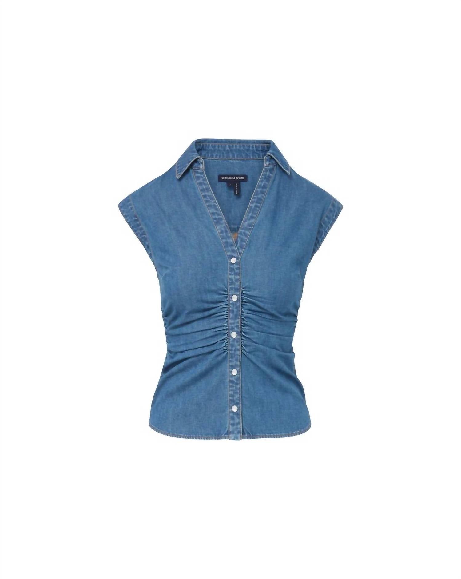 A classic button down shirt that will never go out of style. Introduce a stylish edge to your wardrobe with the Sera Top by Veronica Beard, exquisitely crafted in the crisp shade of Serendipity. Featuring sleeveless cap sleeves and a distinct collared V-neck, this top is expertly tailored from 100% cotton and showcases meticulous front and side ruching for a defined waist and superior fit. You’ll appreciate the elegant opalescent buttons and a practical snap closure, adding a modern twist to its classic charm. With a garment length of 24.13" based on size S, simply turn inside out and machine wash cold, then tumble dry on low to maintain its refined look.