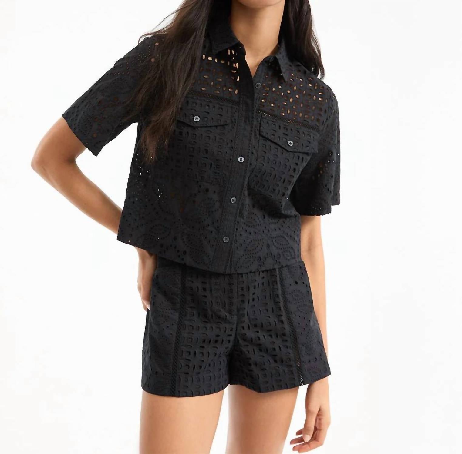 A versatile blouse that works from desk to dinner! An elevated take on the summer shirt. Expertly tailored from lightweight cotton, the black Spruce top boasts a charming allover eyelet design. A warm-weather wardrobe hero, it's tailored for a cropped, boxy fit with wide half-sleeves for an effortless look and feel. Double front flap pockets add a utilitarian feel. Pair with jeans or the matching Fabian shorts for a dose of casual cool. 100% Cotton Lining: 100% Cotton Dry clean only