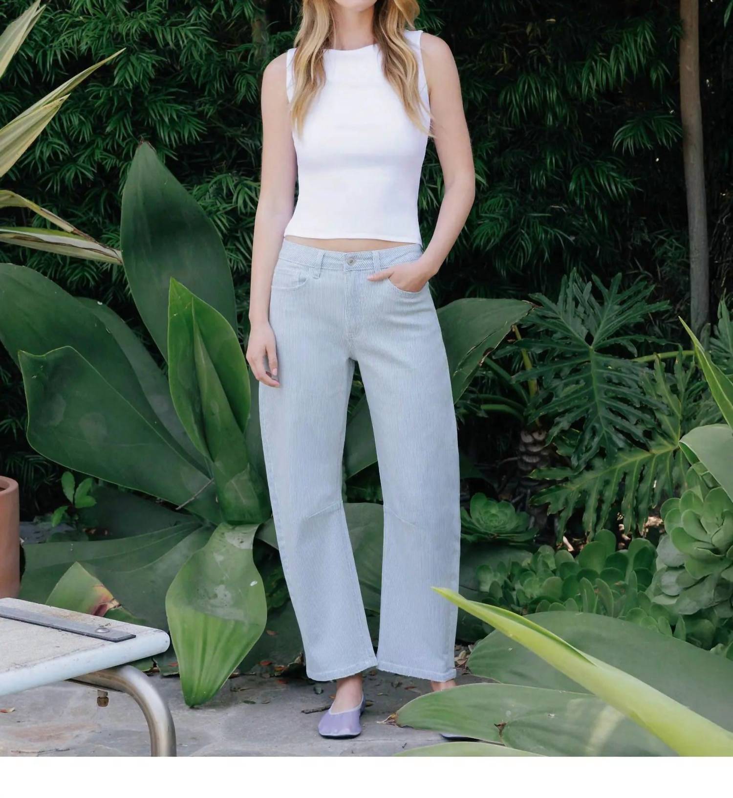 Just as cute as they are comfortable. Introducing the Super High Rise Striped Barrel Leg Jeans by VERVET BY FLYING MONKEY, a chic and relaxed fit for effortless style. These jeans feature a high-rise waist and a cropped length with a 27" inseam, crafted from a comfortable cotton blend. The stylish pull-on closure and wide leg design, along with a light wash and striping detail, make them perfect for streetwear or travel occasions. Dimensions: 11" front rise, 16.5" leg opening. Model is 5'10" wearing a size 26.