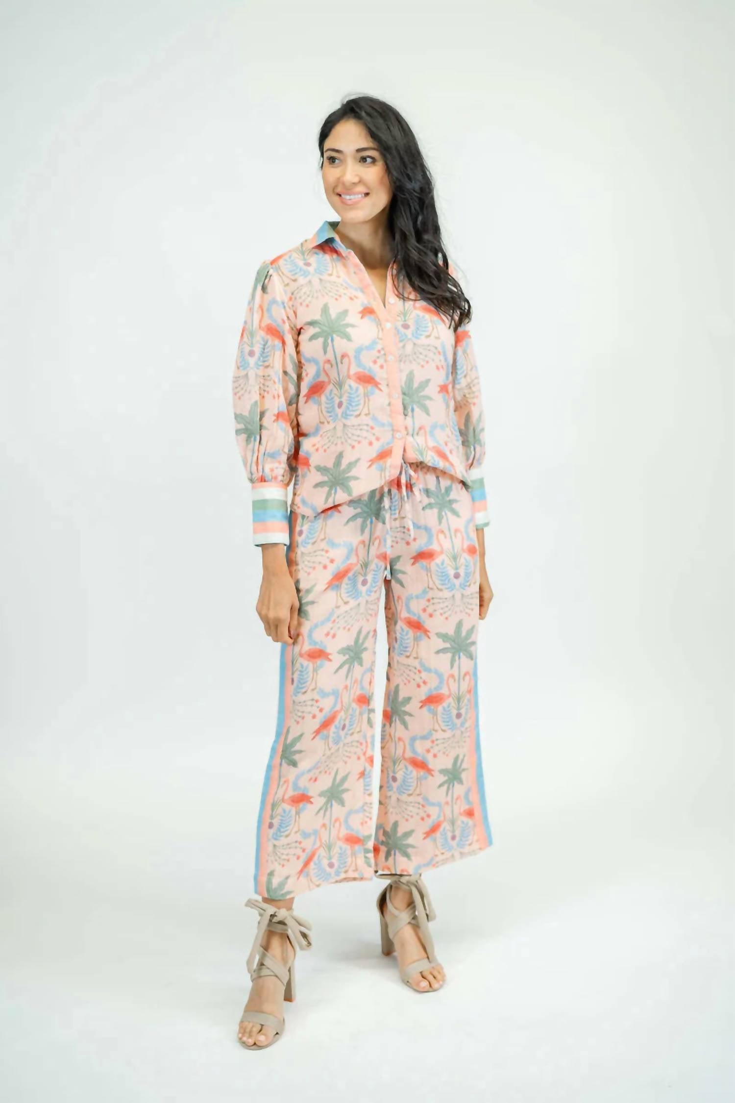 This classic, short sleeve tee will be your go-to staple this season and beyond. Elevate your vacation style with the Victoria Dunn Zara Button Down Top, featuring a vivid tropical print in pink linen. Made from 100% cotton gauze and expertly lined, this playful piece offers both comfort and style. With short sleeves and a classic collar, it fastens with a button closure. Handmade in India, care for this top by hand washing only.