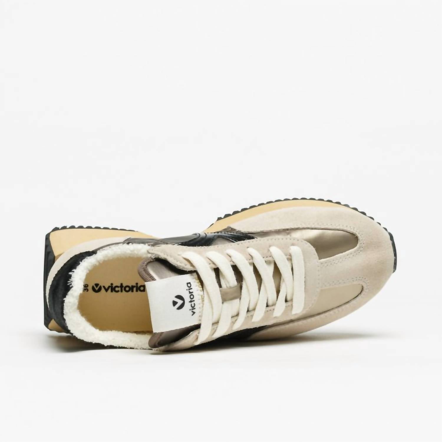 Get your daily steps in with these adorable sneakers. Elevate your style with the Women's Cosmos Sneakers by VICTORIA, crafted in a chic beige hue. The upper is made from cowhide leather adorned with LWG certification medal, enhanced with textile and synthetic materials, providing both sustainability and style. It features a tone-on-tone lace fastening and a round toe design, complemented by a terry fabric lining with a removable insole for optimal comfort. The two-tone EVA and rubber outsole, along with a fluorescent serrated midsole, adds a dynamic and casual touch to these essential sneakers.