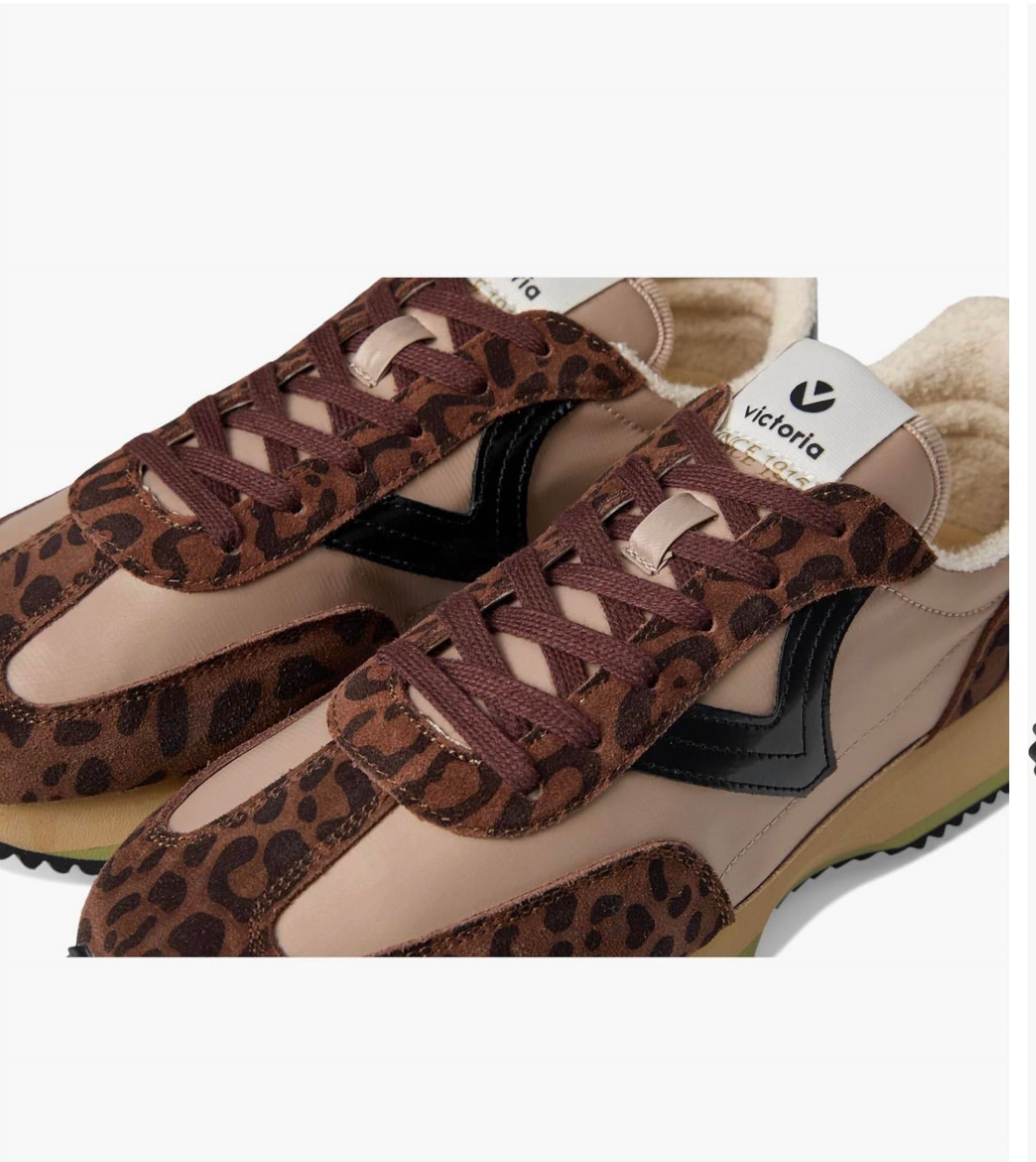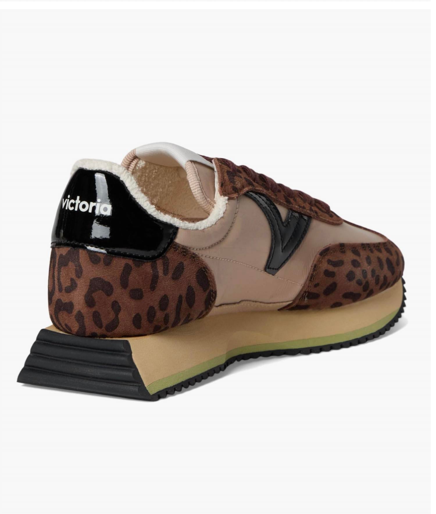 When fashion and function come together seamlessly. Step into summer style with the Women's Lia Leopard Sneakers by VICTORIA, featuring a striking leather upper adorned with a chic animal print in chocolate. These sneakers are designed for all-day comfort with soft terrycloth lining and an EVA insole, perfect for your streetwear and travel adventures. A low-top silhouette and almond toe shape offer a relaxed yet fashionable look, complemented by a lace-up closure with organic cotton laces and a distinctive branding on the tongue and back. Complete with a durable organic rubber outsole, these must-have sneakers combine comfort with a playful flair. Imported.
