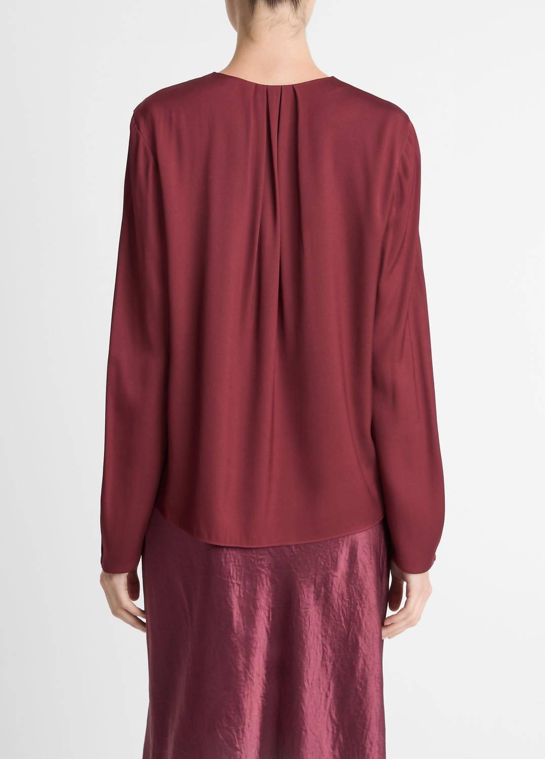 A timeless blouse that will never go out of style. Discover the Silk Blend Pleated Neck Blouse by Vince, a sophisticated addition in a rich Bordeaux hue. This elegant piece features long sleeves and a crewneck design with soft pleating around the collar and cuffs, complete with a keyhole slit secured by a metal-ball button. Its luxurious composition includes 55% silk, 38% viscose, and 7% spandex, crafted in an imported design. Closure: Pull on with a keyhole button-and-loop at the front, ensuring a sleek silhouette. Care: Hand wash cold, line dry, and cool iron if necessary, or opt for dry cleaning. Length: 24.75".