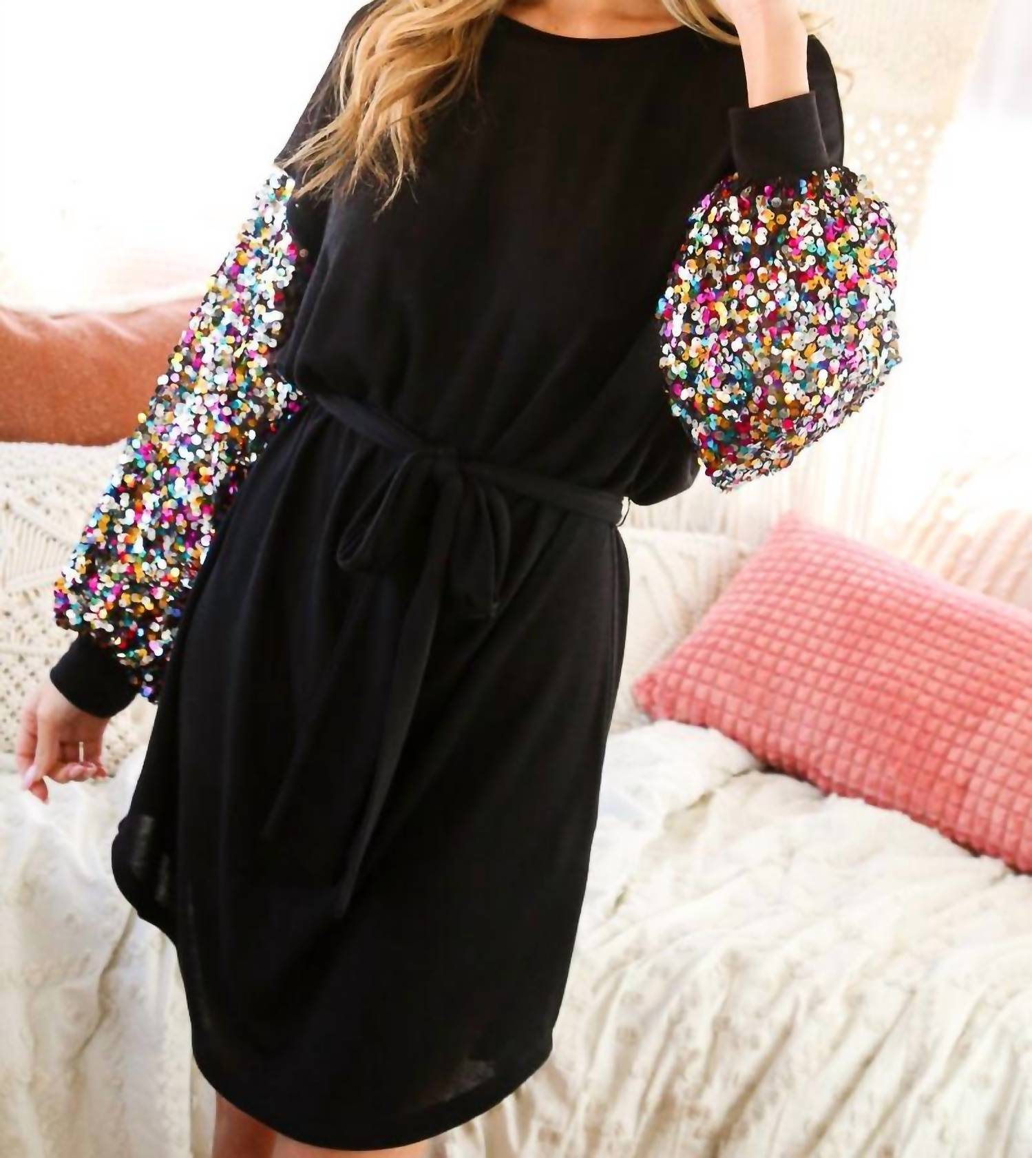 A short and breezy dress for those warmer days. Discover the Sequin Sleeve Dress by Vine & Love, the perfect choice for a stunning evening event this spring. With long sequin-adorned sleeves and a drop shoulder puff design, this black mini shift dress brings a textured maximalist flair. Featuring a crewneck neckline and a stylish tie closure belt for a flattering fit. Made for women who love to shine, this head-turning piece is ready to impress.