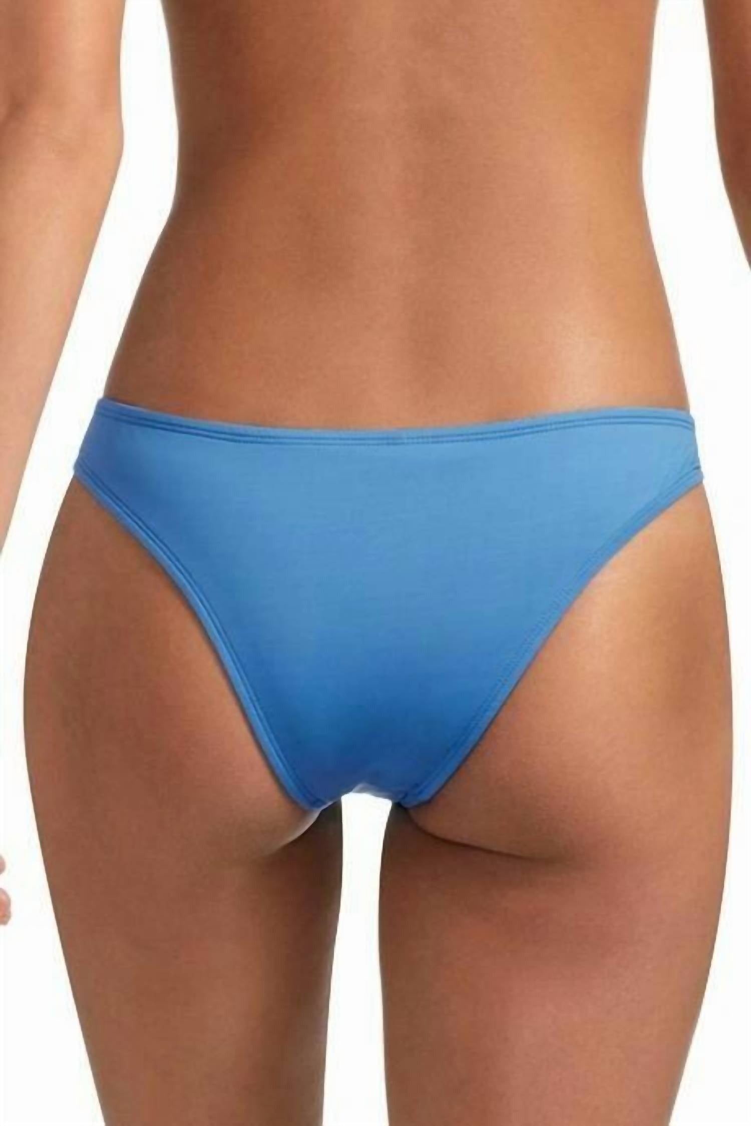 Dream of your next beach getaway in this cute little number. Pair with strappy sandals, a floppy hat, and an oversized tote to complete the perfect vacation look. Elevate your swimwear collection with the Neutra Hipster Bikini Bottom by Vitamin A, showcased in a striking Mediterranean Blue Ecolux. This cheeky, mid-rise bikini bottom effortlessly combines 83% Recycled Nylon, 17% Lycra for a sustainably soft feel, featuring strappy insets for a modern architectural look. Made in the USA, this piece offers a smooth, clean finish in the front, while the back provides a stay-in-place design perfect for any beach day. Care instructions include hand washing and laying flat to dry, keeping your minimalist style ready for every sunny adventure.