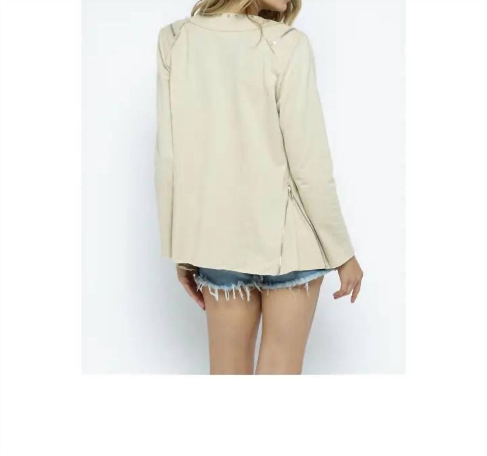 A jacket so versatile you can literally wear it with anything. Introducing the Stud Jacket With Shoulder & Side Zippers by VOCAL APPAREL, a statement piece designed for a modern and edgy look. This natural-colored, long-sleeve jacket features a cotton blend composition with 85% Cotton and 15% Polyester for the self, and a contrast of 95% Cotton and 5% Spandex for added softness. Designed with shoulder and side zippers, it offers a versatile style perfect for travel or casual wear. Care instructions include machine wash in cold water, tumble dry low or lay flat to dry, and iron on low heat if needed.