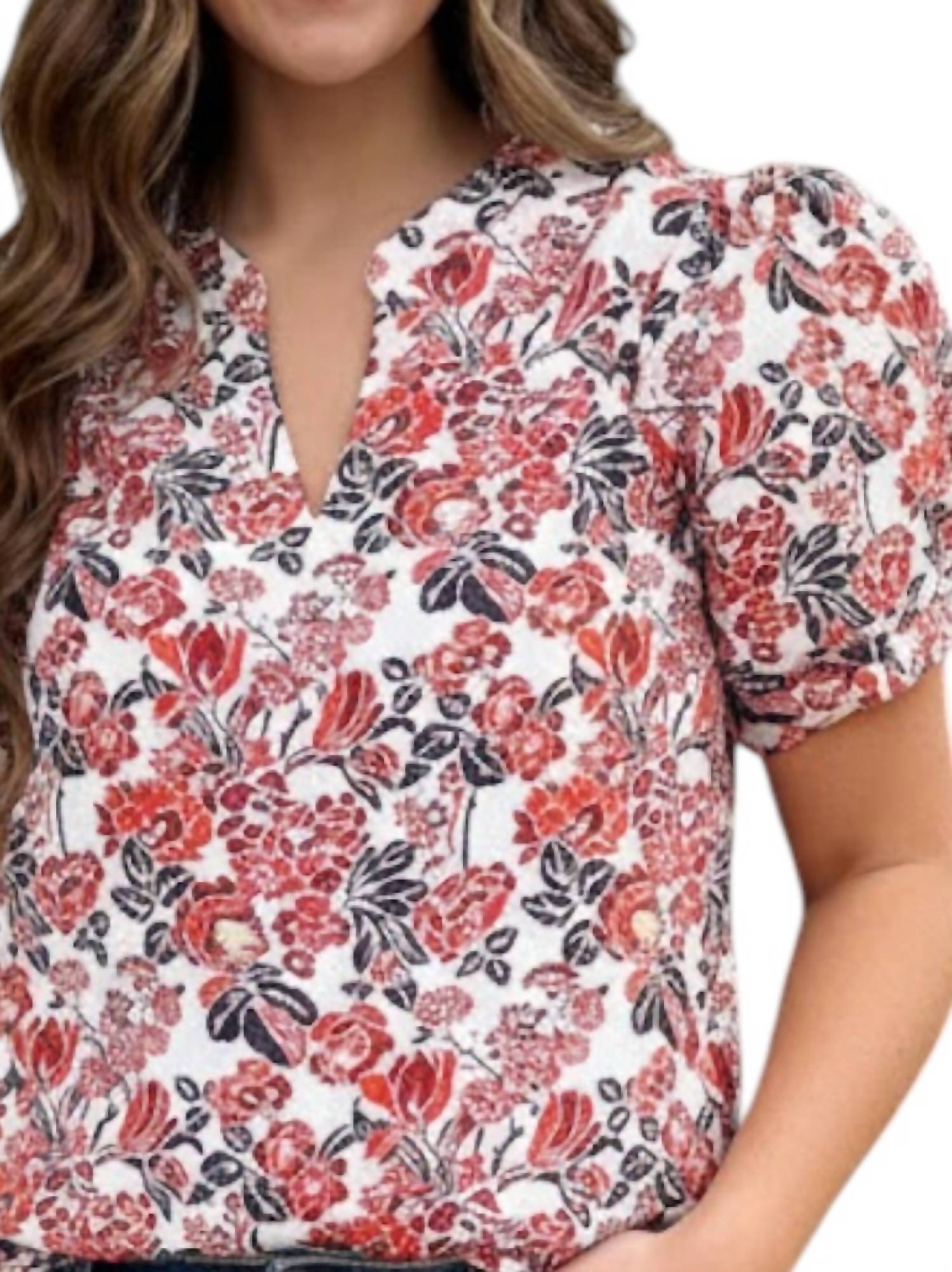 A versatile blouse that works from desk to dinner! Introducing the Diana Floral Jacquard Blouse by Voy, a vibrant addition to your wardrobe. With short sleeves and a playful multi-color floral pattern, this blouse is crafted from delicate jacquard material. Featuring a V-neckline, it offers a pull-on closure for ease of wear and is designed with a maximalist trend in mind. It is perfect for embracing the spring season with flair. Care: Hand wash, tumble dry.