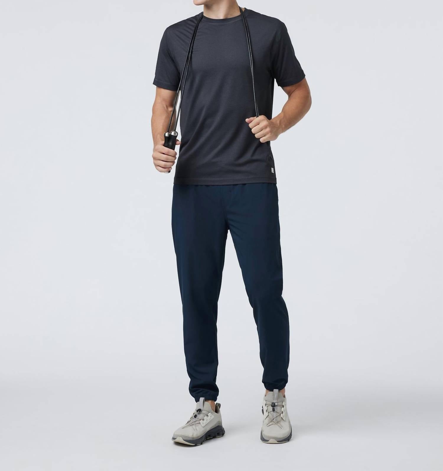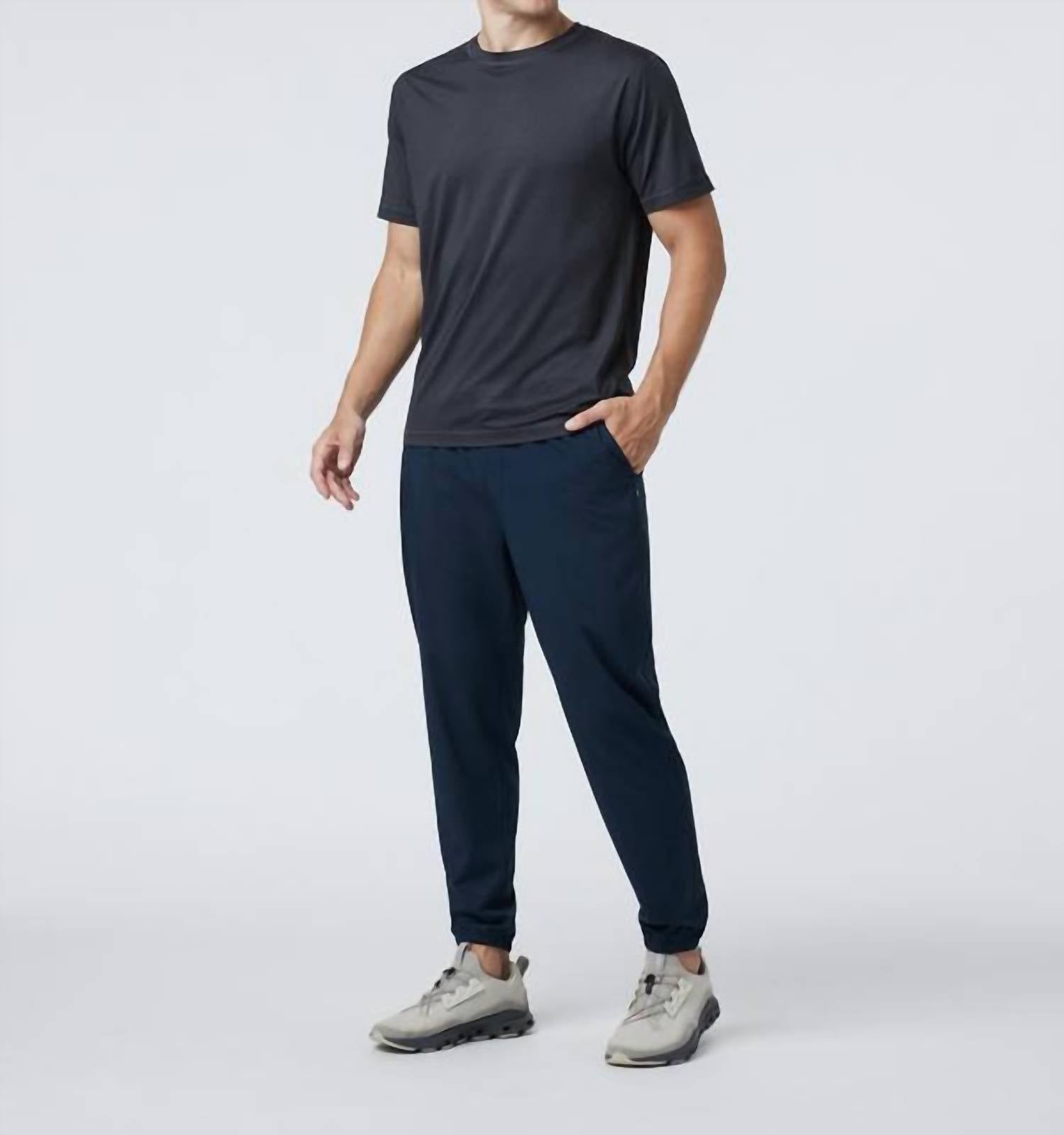 Discover comfort and performance with Vuori's Kore Stretch Jogger in Ink, perfect for any fitness routine or athleisure trend. Crafted from a blend of 48% recycled polyester, 42% polyester, and 10% elastane for the shell, this jogger ensures a relaxed fit with a tapered leg and mid-rise waist. It features a tie closure and includes convenient pockets. Easy to care for, these joggers can be machine washed and tumble dried.
