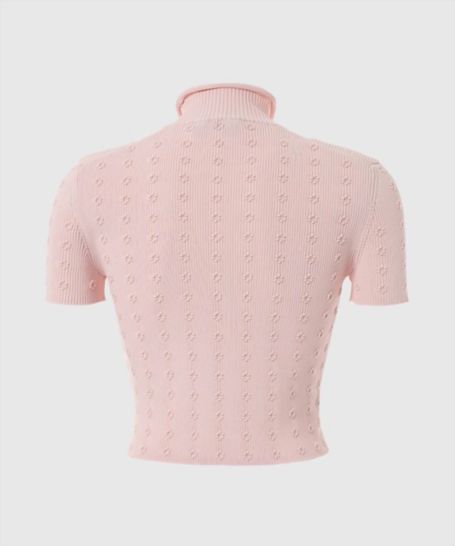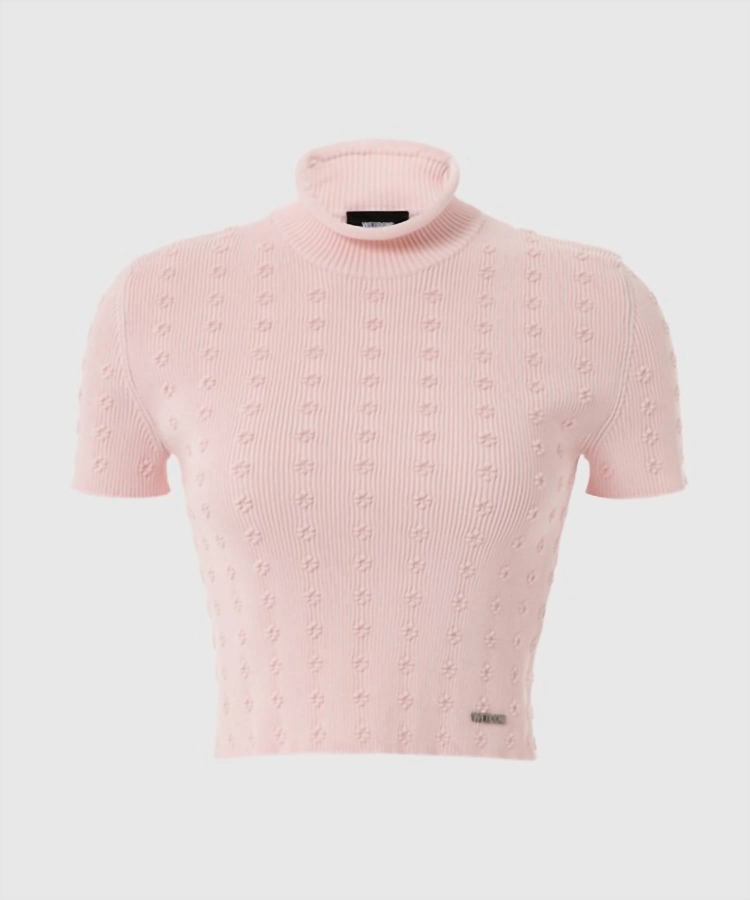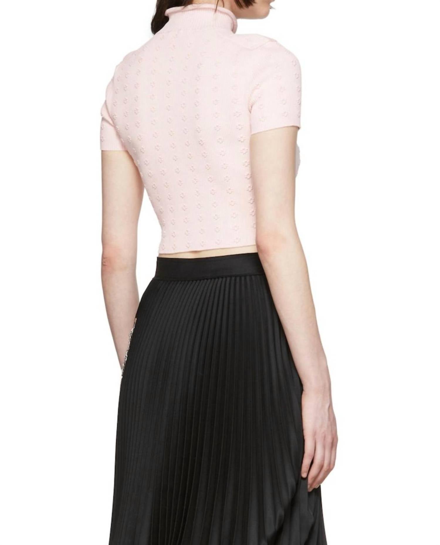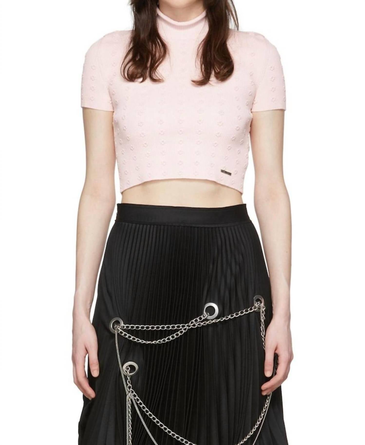 Pair this crop top with your favorite high-waisted jeans or maxi skirt. Elevate your evening look with the Floral Knit T-shirt by We11Done, a minimalist piece in a subtle light pink. Crafted from a textured rayon-blend, this crop top flaunts short sleeves and a rib knit turtleneck adorned with a raised jacquard floral pattern, plus a logo plaque at the front hem. Composition: 60% Rayon, 30% Polyester, 10% Nylon. Closure: Pull on.