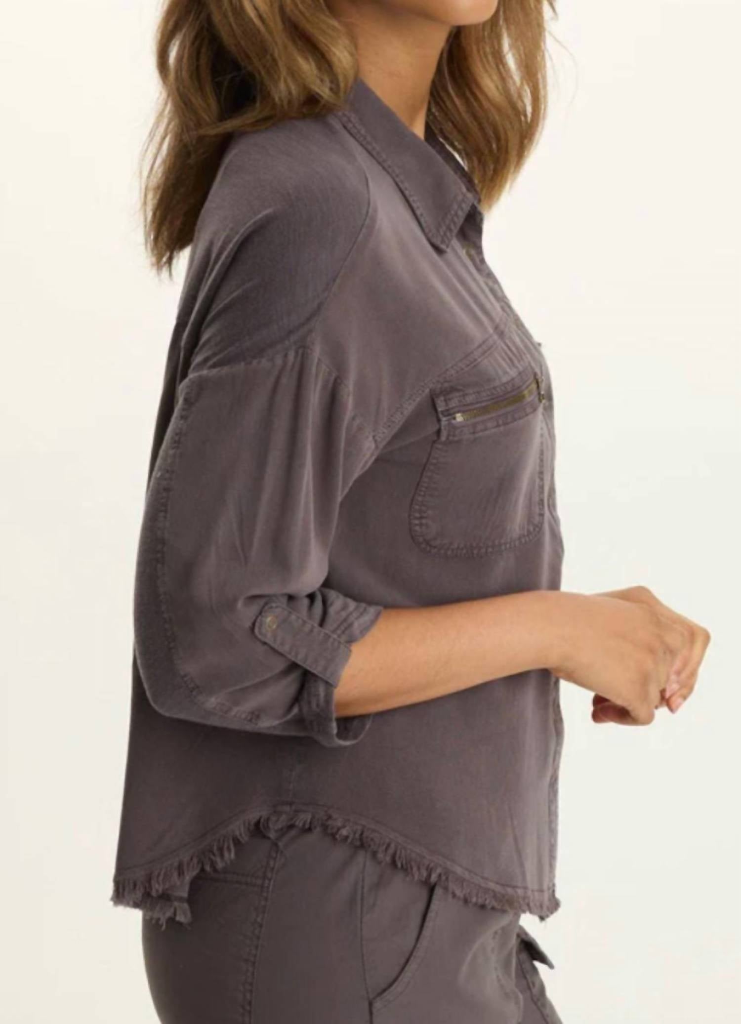 A long sleeve top you can wear with denim, skirts, well... just about anything! Introducing the Knapp Distressed Cargo Button Up Top by Wearables, a chic charcoal piece perfect for minimalist spring styling. Designed with three-quarter sleeves and a classic collar neckline, this versatile top combines Taissa Twill and Lucille Slub Jersey fabrics for a comfortable fit. The garment features button closure and measures approximately 20.5" at the center front and 24" at the center back. It's preshrunk for lasting wear and easy maintenance with machine wash care instructions.