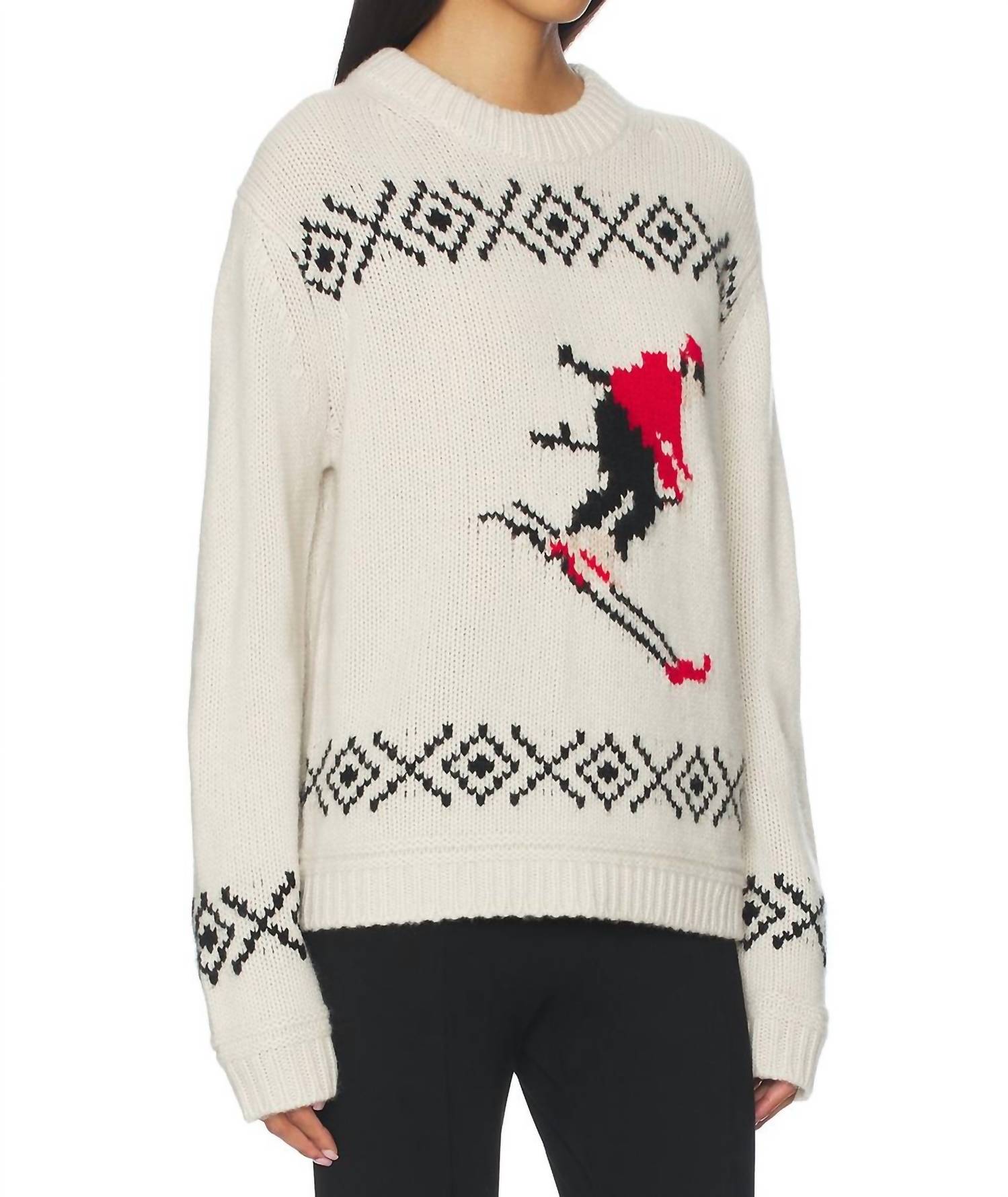 Experience the perfect blend of comfort and style with this trendy crew neck sweater, designed to effortlessly elevate your wardrobe. Pair it with your favorite denim and loafers for the perfect look. Elevate your winter wardrobe with the Ski Crewneck Sweater by White + Warren, a chic choice for women in the festive color palette of ivory, black, and red. This long-sleeve sweater combines the luxurious blend of 70% wool and 30% cashmere, offering unparalleled warmth and comfort. Originating from Cambodia, it features a classic crewneck and a graphic pattern, ideal for holiday parties and a vintage-inspired look. With a convenient pull-on closure, this sweater requires dry cleaning to maintain its exquisite quality.