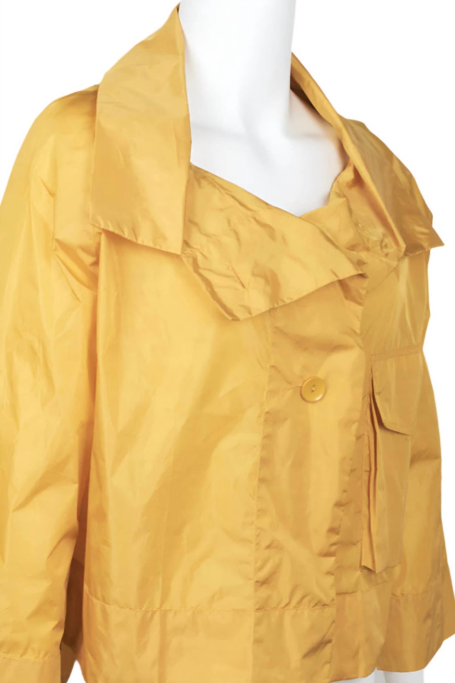 A casual yet cool jacket that every closset needs. Stay stylish and protected with the Women's High Neck Collared Button Pocket Jacket by Why Dress. This long sleeve jacket is crafted from 100% durable nylon in a striking gold color, offering lightweight yet robust protection ideal for all your outdoor adventures. Designed with a high-neck collar for added warmth, this piece features a classic button closure and convenient functional pockets for essentials. Care is simple with a hand wash recommended to preserve its quality and longevity.