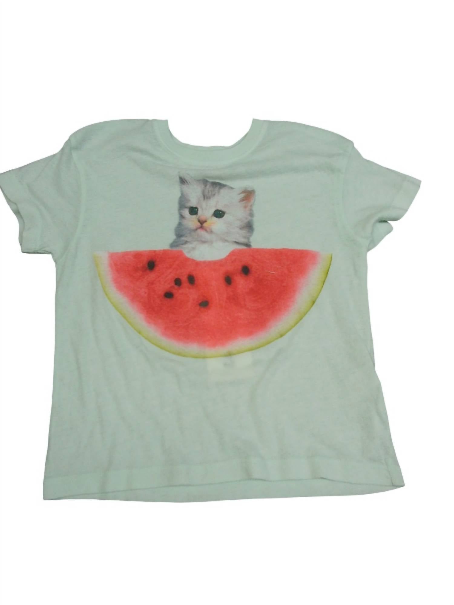 The Kids' Cat And Watermelon Shirt by WILDFOX is a playful addition to any young fashionista's wardrobe. With its soft, 100% cotton fabric, this tee ensures comfort in a refreshing Sea Mist color. It features cute short sleeves and a fun graphic pattern that shapes its trendy streetwear appeal. Effortless care with machine wash instructions makes it a practical choice for busy parents.
