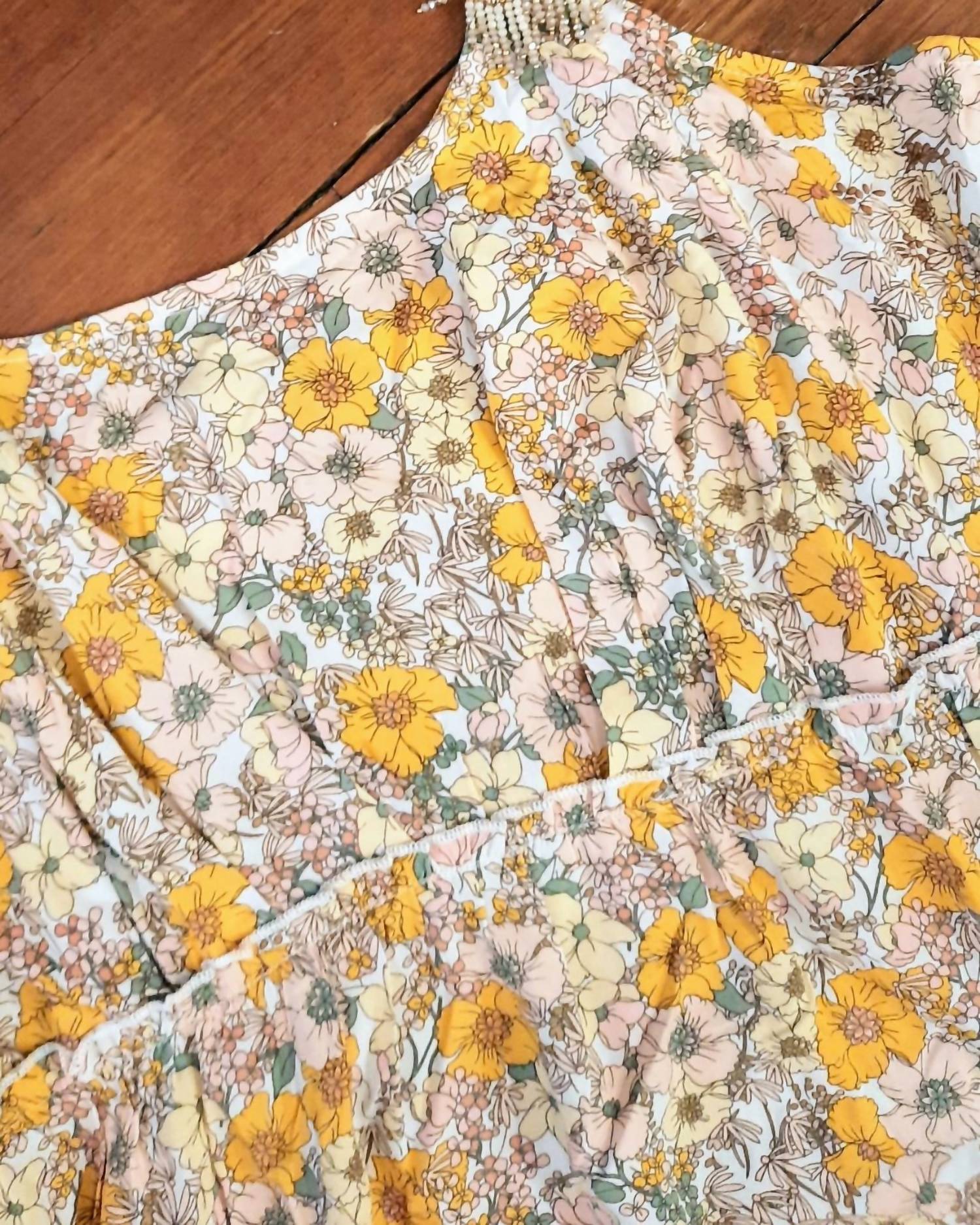 The perfect mini dress for those warmer months. Brighten up your summer wardrobe with the Women's Floral Tie Sleeve Sun Dress by Winslow Collection. This sleeveless A-line dress in a cheerful yellow floral pattern features a stylish tie sleeve design and a flattering scoop neck. Crafted from 100% Rayon, it falls elegantly to knee length and ensures comfort with a pull-on closure. Care instructions include machine wash, making it a practical choice for your vacation essentials.