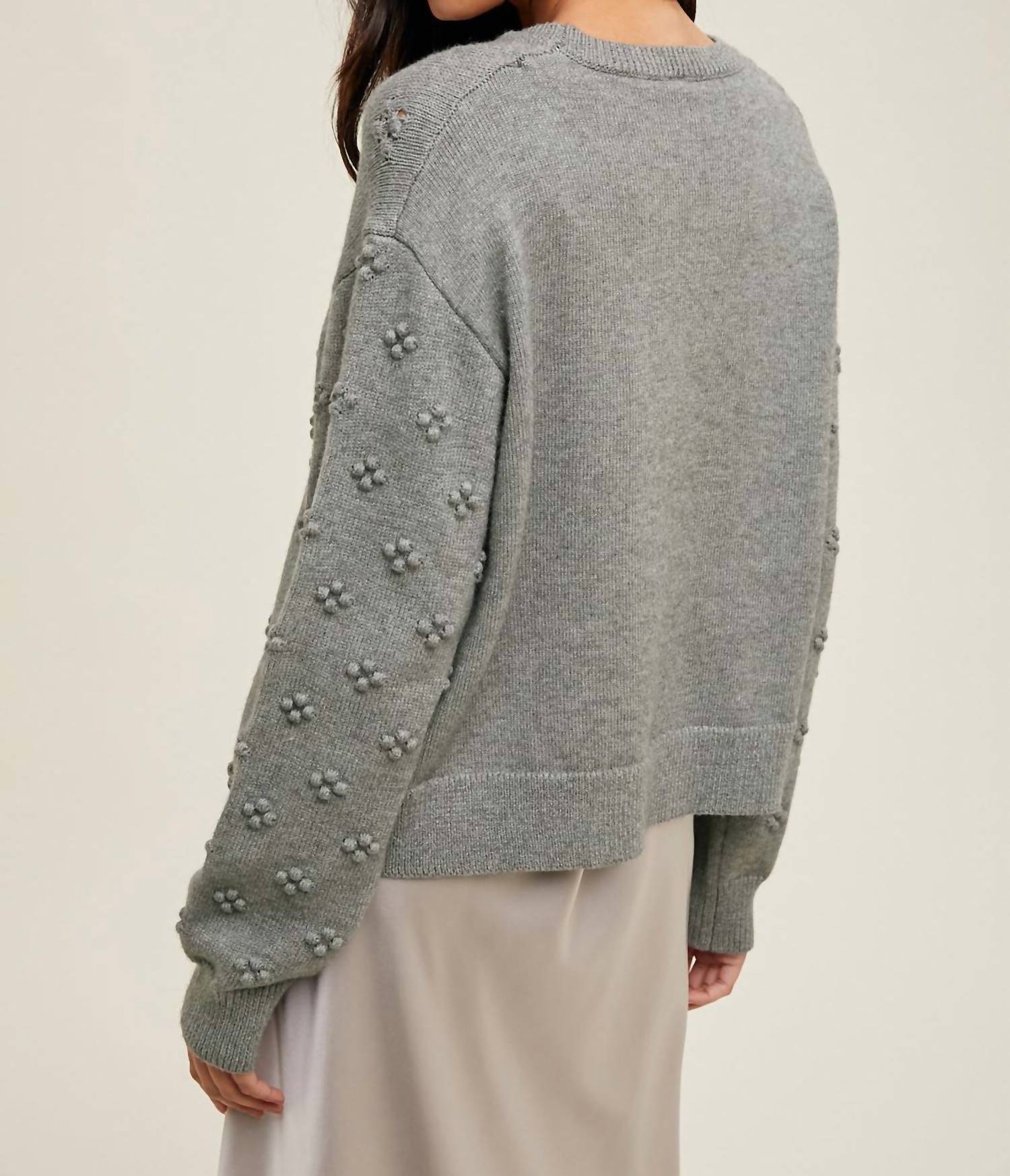 The ultimate go-to sweater, expertly crafted to provide the perfect combination of warmth and style. Its classic design and soft fabric make it a must-have addition to your wardrobe. Upgrade your sweater collection with the Beatrice Long Sleeve Sweater by WISHLIST, perfect for cozy fall days. Made from a viscose blend, this lightly heathered grey sweater features a diamond patterned pom-pom detail for a textured look you'll love. The relaxed fit provides a comfortable wear, with a pull-on closure and a crewneck adding to its effortless appeal. The bust measurements are 41" (S), 43" (M), and 45" (L), with garment lengths of 22" (S), 22.5" (M), and 23" (L), making it easy to find your perfect fit. Care: Hand wash only.