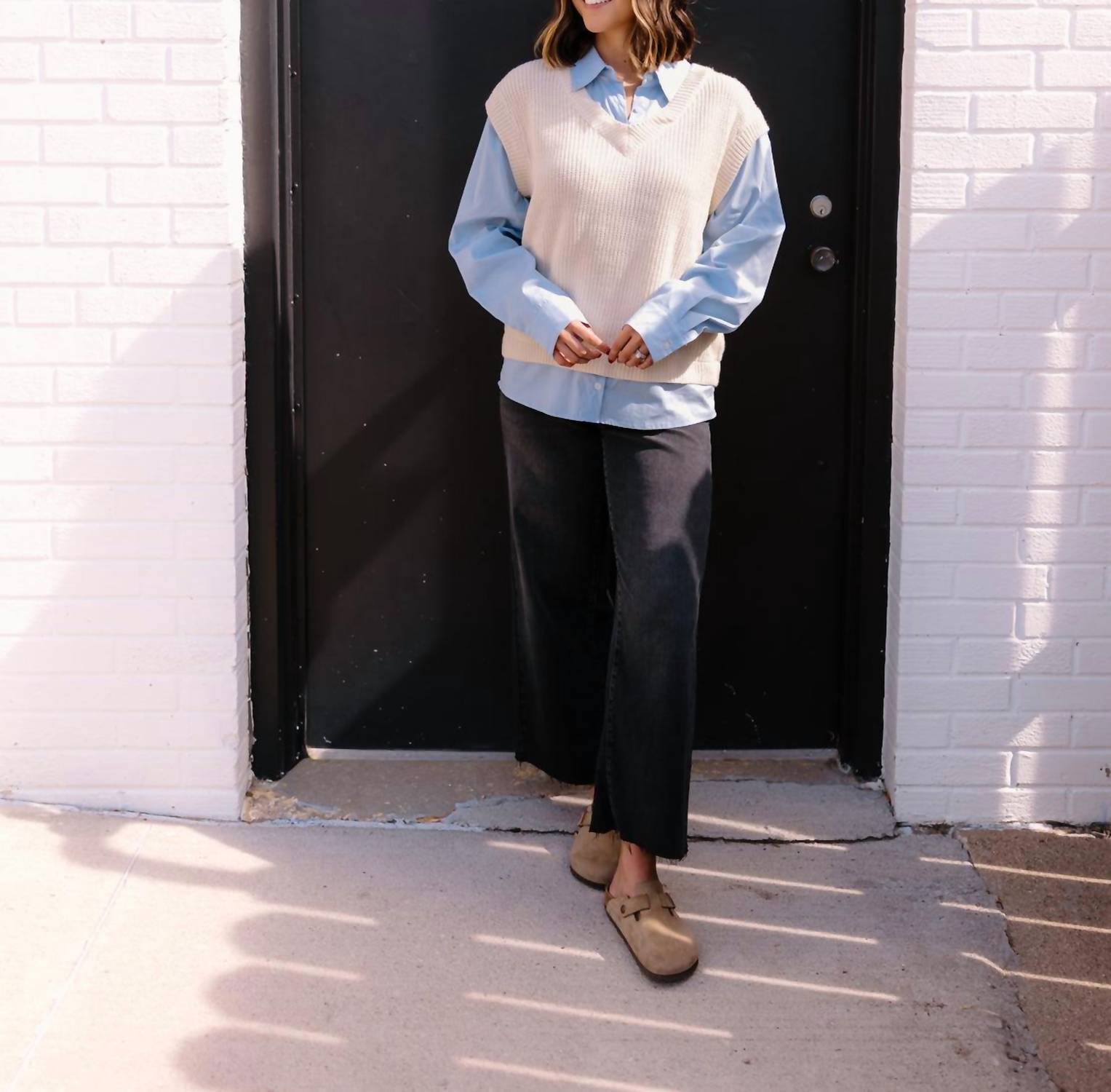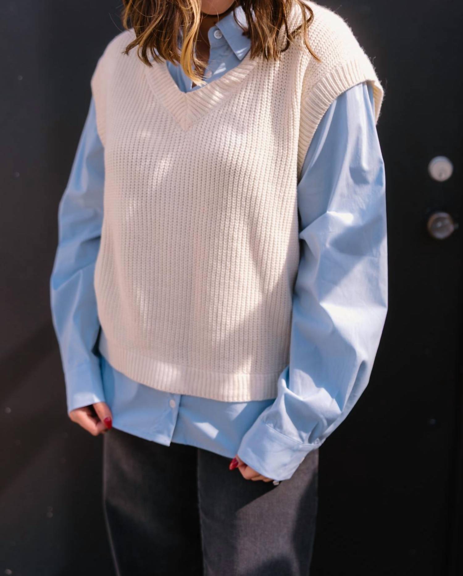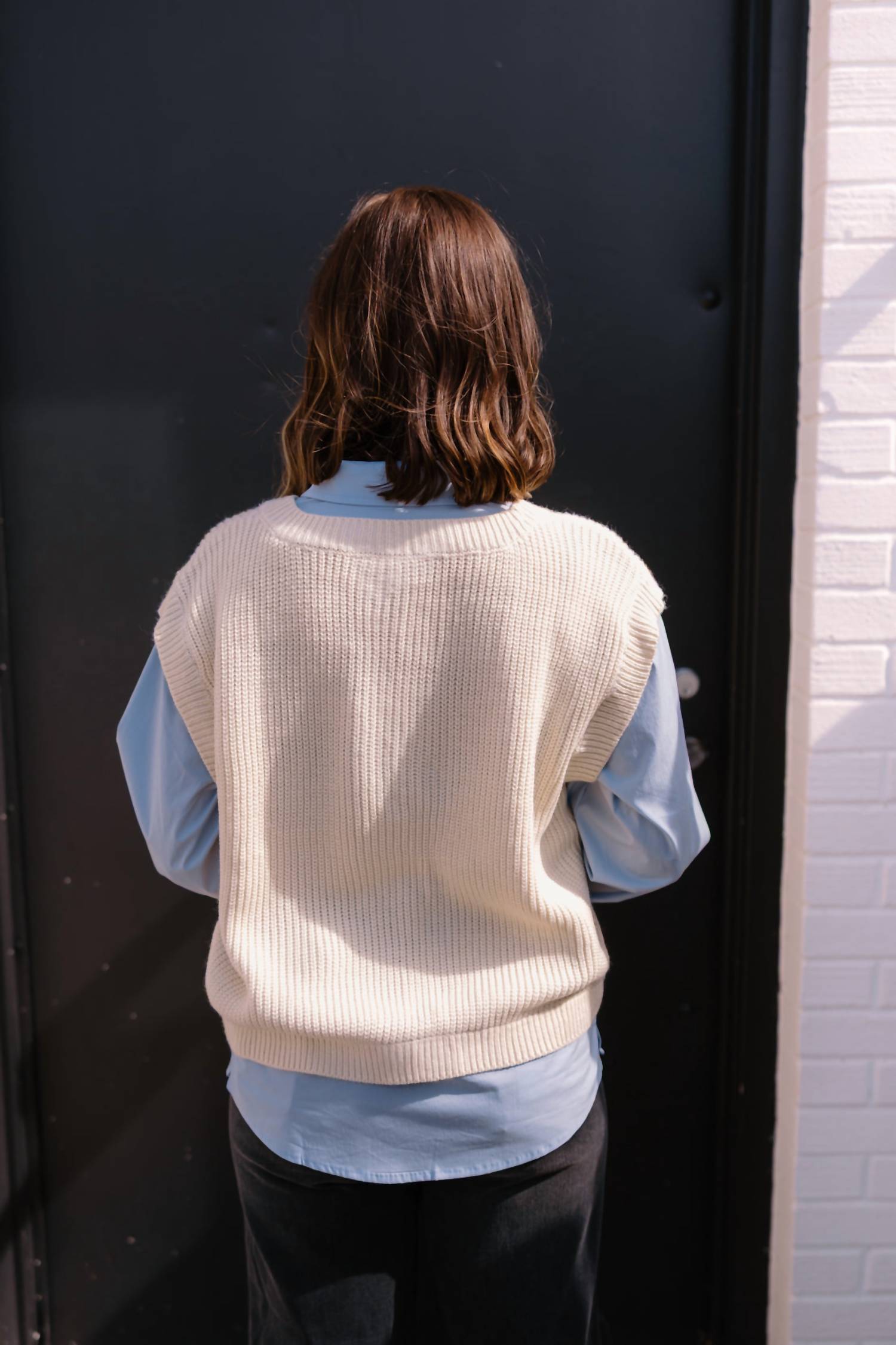 Throw this vest over an all black outfit for a perfectly polished look. Elevate your fall wardrobe with the Tiffany Sweater Vest Shirt by WISHLIST, a textured masterpiece in cream and blue. This women’s long sleeve piece combines the charm of a classic collared neck with playful, professional appeal, perfect for streetwear and Thanksgiving gatherings. Made from a cotton blend (60% Cotton, 40% Acrylic) for cozy comfort, it has a pull-on closure and is perfect for travel occasions. Care instructions advise hand washing and line drying. Model is wearing a small (5'4" height, 33.5" chest, 27" waist, 38" hip, 27.5" inseam).
