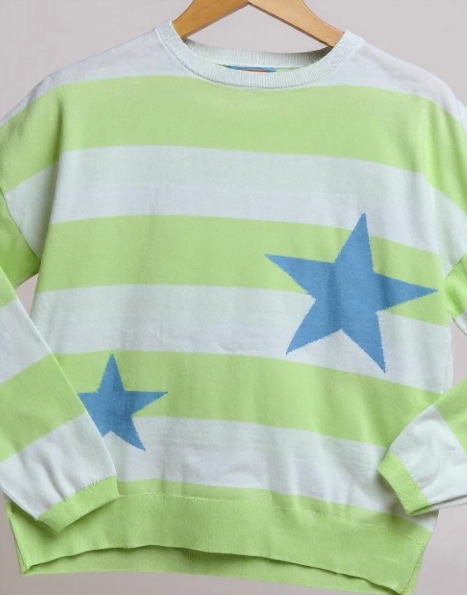 Elevate your vacation wardrobe with the Women's Stripe Star Sweater by Wispr, showcasing a chic blend of mint green and light blue in a 90s-inspired design. This crewneck sweater features long sleeves and a striking stripe pattern. Closure: Pull on. Perfect for a stylish spring outing, embodying a retro flair without the fuss of pockets.