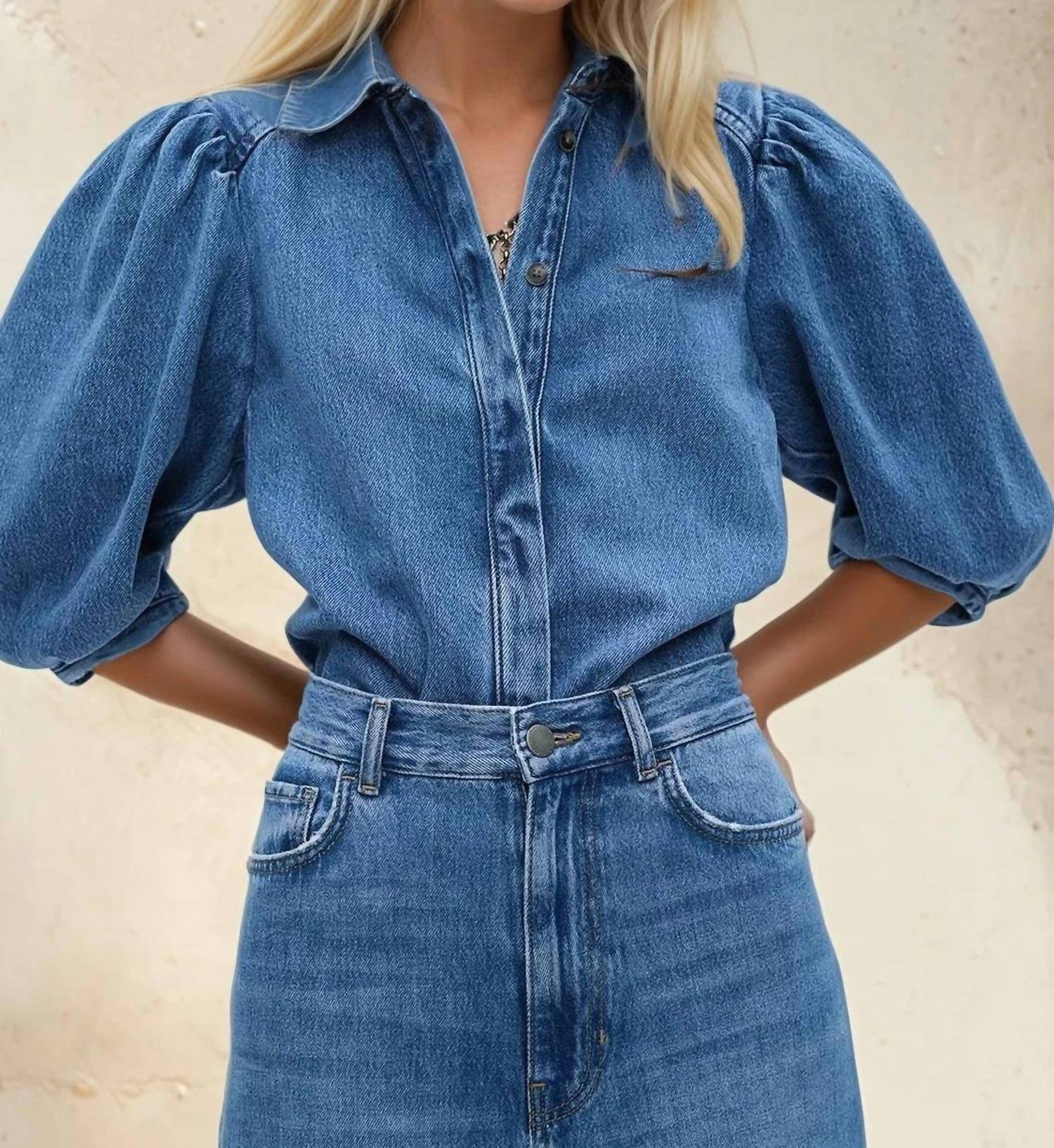 A versatile blouse that works from desk to dinner! Introducing the Balloon Sleeve Denim Shirt by Wisteria Lane, a chic addition to your fall wardrobe in classic denim blue. This blouse features elbow-length puff sleeves and a lapel collar that adds a touch of elegance to the streetwear-inspired design. Made from a comfortable cotton blend, this imported piece is effortlessly stylish and designed for exploration.