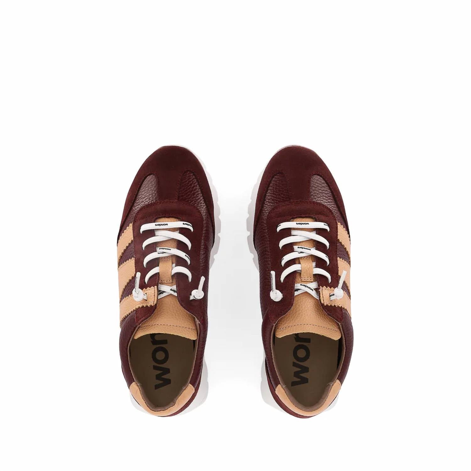 When fashion and function come together seamlessly. Step into style and comfort with the Wonders Women's Trend I Sneaker in Vino/Plum Peach. Masterfully crafted in Spain, this sneaker boasts a leather and textile upper, perfect for the fashion-conscious woman. Enjoy the practical flat heel with a 1.37-inch height, enhanced by the WondersFlyâ„¢ technology toothed sole for unmatched lightness and comfort. Whether you're attending an evening event or embracing the athleisure trend this fall, these sneakers are the ideal choice.