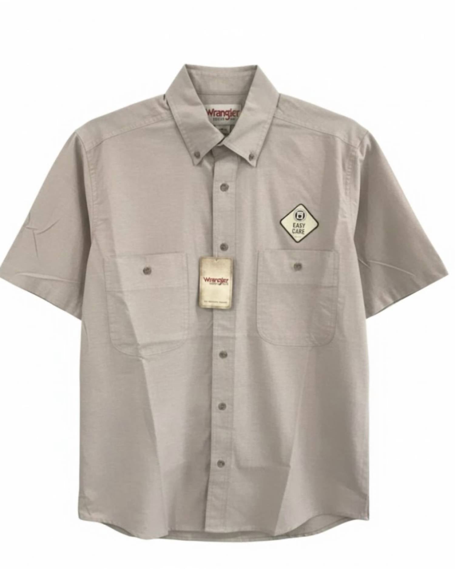 Elevate your wardrobe with the Men's Short Sleeve Button Up Shirt by Wrangler, tailored for both comfort and style. Made from a durable cotton blend(98% cotton and 2% spandex), this shirt features a solid tan design perfect for the monochrome trend. It includes a button closure and functional pockets for added convenience. Effortless maintenance with machine wash and tumble dry instructions makes it a practical choice for any man.
