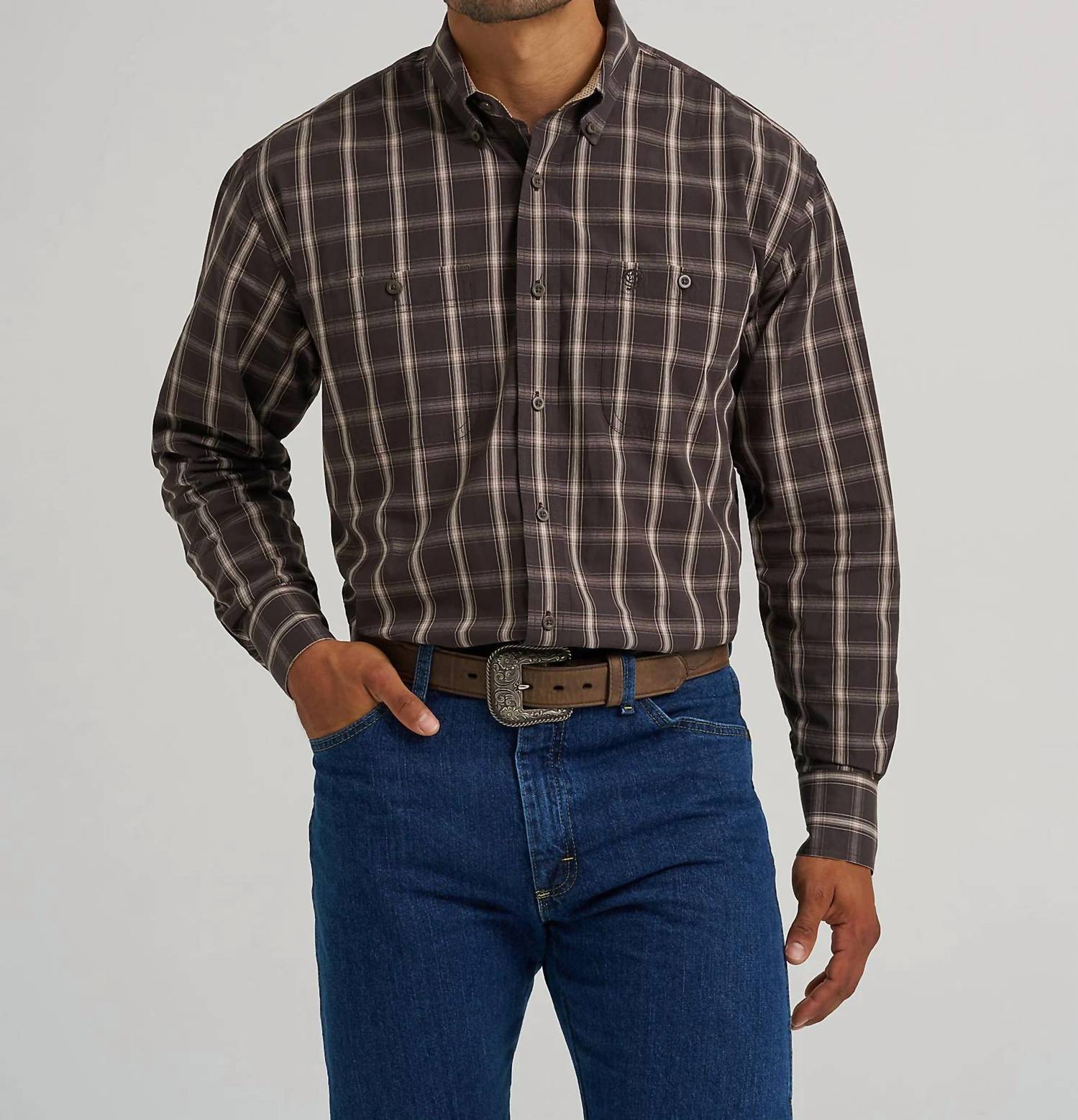 For a refined touch in your casual wardrobe, consider the Wrangler George Straitâ„¢ Two-Pocket Button-Down Shirt in classy brown plaid. This long-sleeve shirt, tailored from a comfortable 98% cotton and 2% spandex blend, ensures a relaxed fit with its straight back yoke and adjustable two-button cuffs. Its practical design includes two button-through pockets and a curved hem, making it ideal for travel or a laid-back western look. With a button closure and a collar neckline, this shirt offers both style and functionality for any occasion.