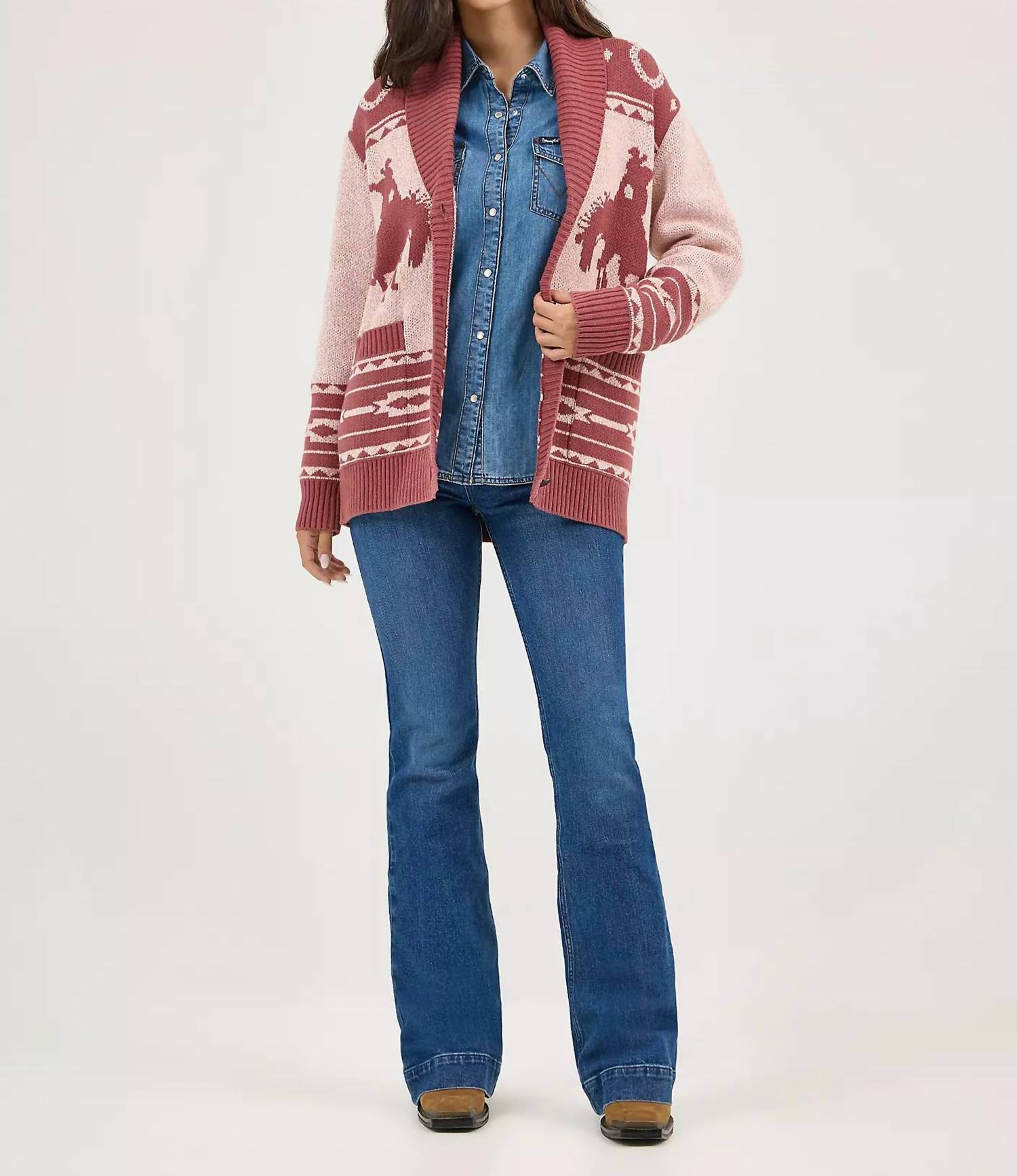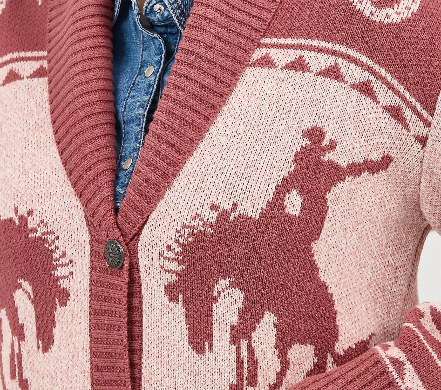 Throw this adorable cardigan over any cami or tank top. Experience cozy comfort with the Women's Wrangler Retro Western Cardigan, tailored for your fall travels. This long sleeve cardigan is crafted from a cozy cotton blend composition of 60% cotton and 40% acrylic, offering a brushed finish for extra softness. Designed in a lively pink color with captivating graphic patterns featuring horses and horseshoes, it features a practical button closure and a ribbed cuff for added warmth. Care is simple—hand wash and lay flat to dry—making it a hassle-free addition to your wardrobe.