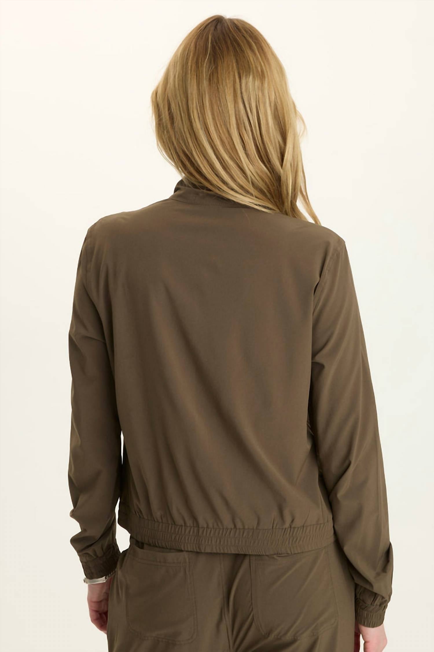 A riff on your favorite classic bomber jacket. Introducing the Active Quinn Bomber by XCVI, an ideal choice for your fall travel wardrobe in a rich clove hue. This women's bomber jacket features long sleeves and a practical zip closure, perfect for embracing the workwear trend with comfort and style. Crafted from polyester and designed with a mockneck and convenient pockets, this jacket maintains a solid pattern for versatility. Care for this piece with ease through machine washing, making it a reliable addition to your seasonal fashion lineup.