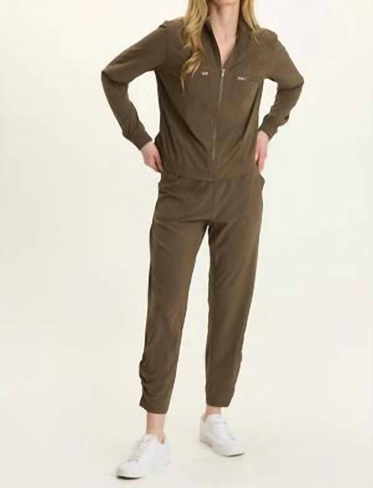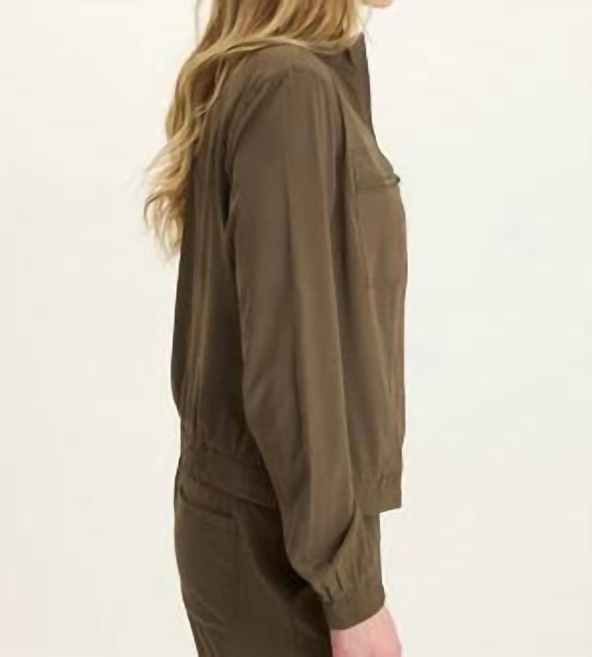 Nothing is cooler than this vintage inspired bomber jacket. Meet the Active Quinn Bomber Jacket by XCVI, an elegant merger of style and functionality. Crafted from a Whisper Stretch blend of 88% Polyester and 12% Spandex, this solid-colored jacket in Clove boasts long sleeves and a zip closure for easy wear. Featuring a chic ruched hem and cuffs, it offers a flattering fit with a center front length of approximately 20.25" and a center back length of about 21.25". Designed for versatile wear, it's machine washable and should be laid flat to dry.