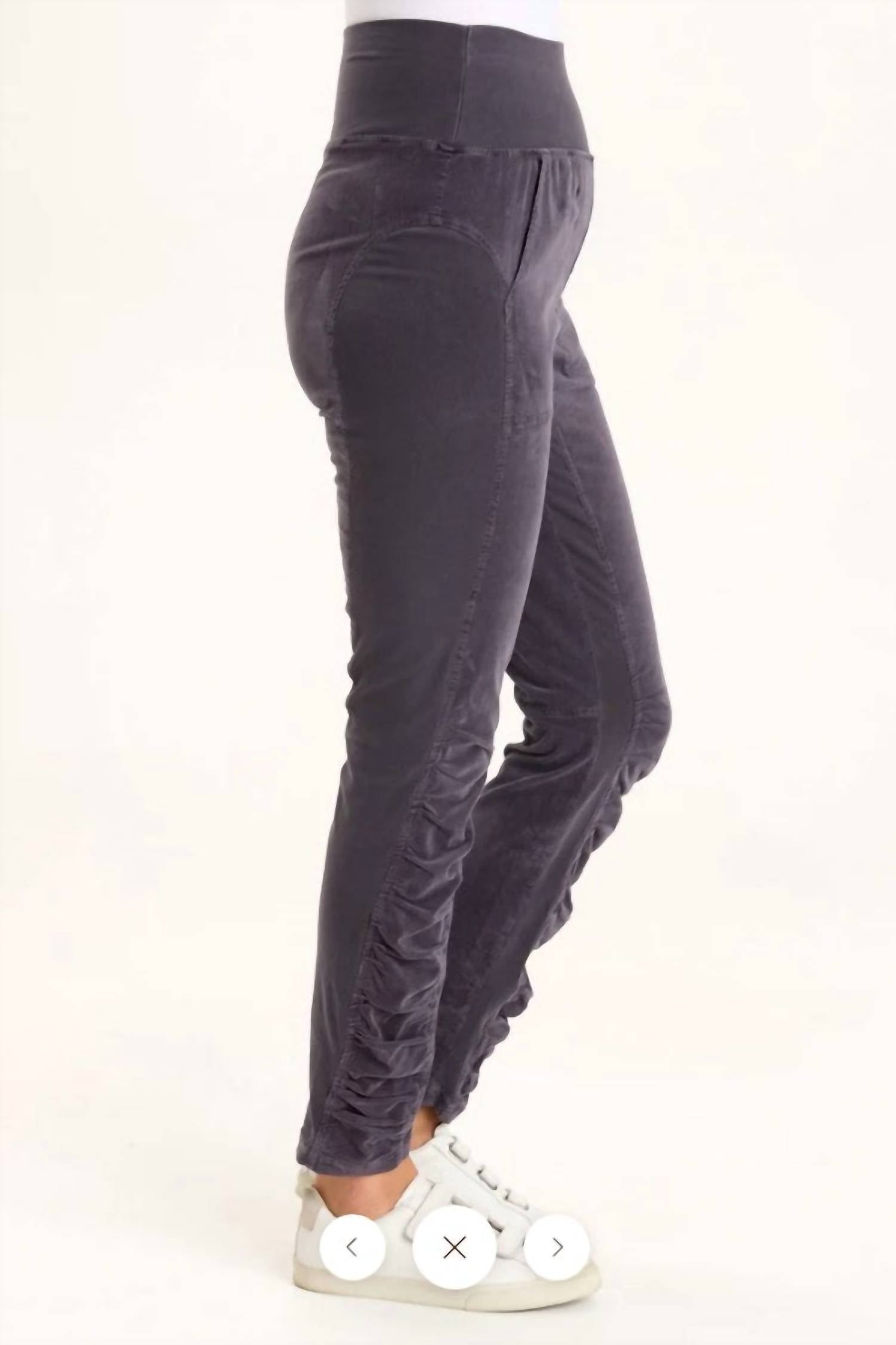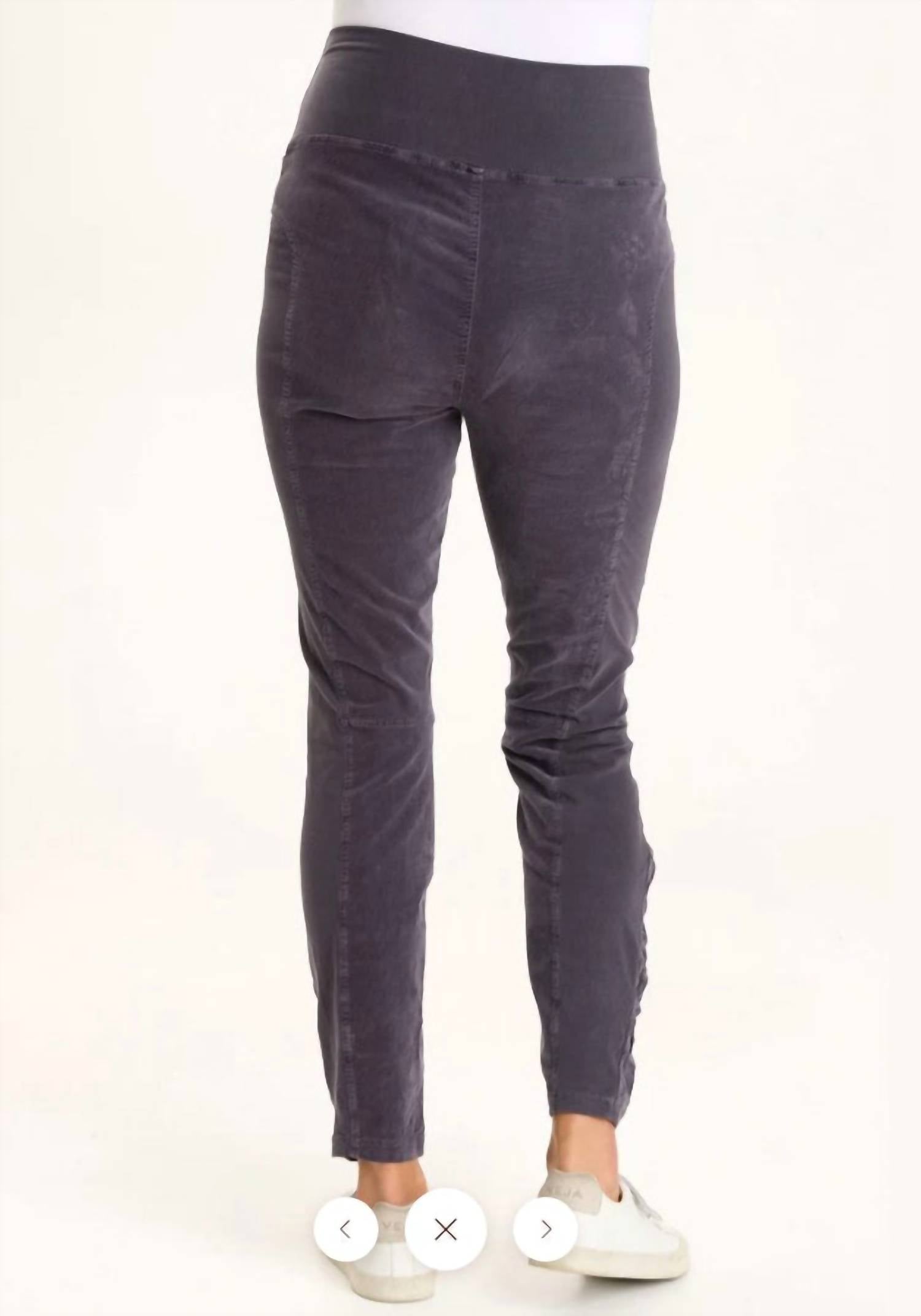 Leggings you can dress up or down for any occasion. Introducing the Cord Penny Leggings by XCVI, designed for style and comfort in a Seaport color. These high-waisted leggings feature soft stretch corduroy with ruching on the leg panels and include front pockets for added functionality. Made from a comfortable cotton blend (97% Cotton, 3% Lycra), they boast a slim fit with a 28" inseam and a 12.25" front rise. Closure: Pull-on style. Care: Preshrunk and machine washable, tumble dry.