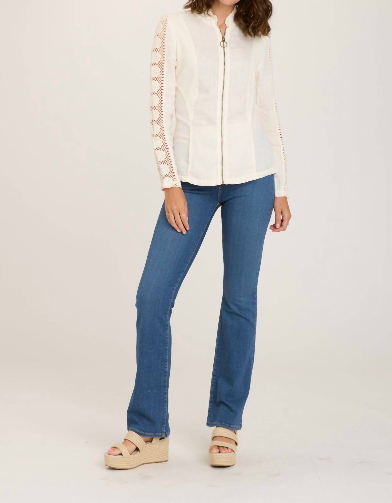 A jacket so versatile you can literally wear it with anything. Meet the XCVI Crochet Zip Up Jacket, a stylish addition to your wardrobe designed for versatility and comfort. Crafted from 95% Cotton, 5% Spandex, this long sleeve jacket in a solid ivory color is perfect for layering during fall occasions like Thanksgiving. It features elegant crochet detailing and a convenient zip closure, adding sophistication to any outfit. Care is simple with a machine wash and lay flat to dry.
