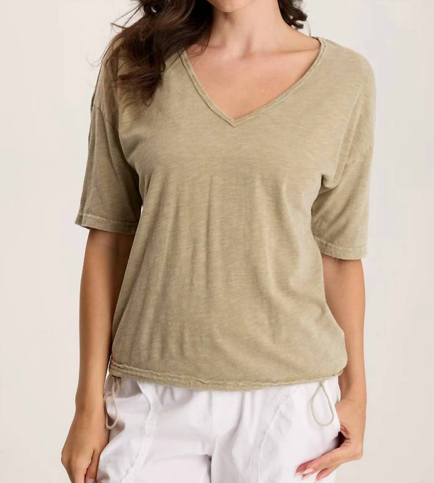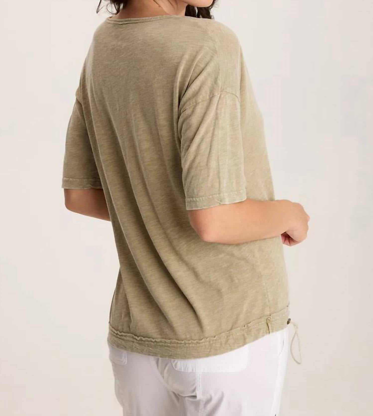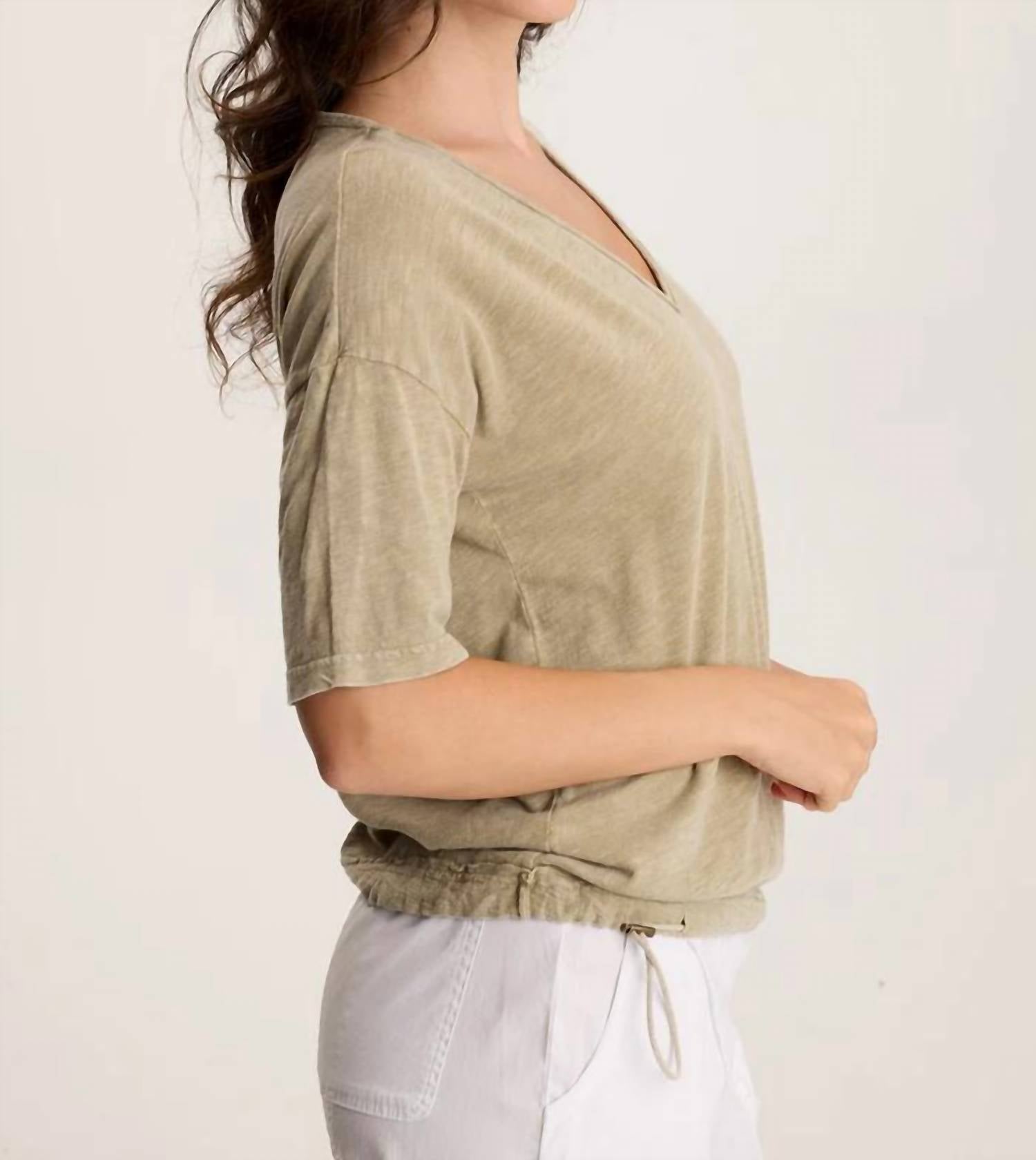 The short sleeve tee you'll want in every color. Discover the Rajni Tee by XCVI, a minimalist piece in the serene shade of Karma, perfect for spring travel. This short-sleeve jersey top features banded elbow-length sleeves and a stylish V-neck cut, complete with an adjustable corded hem. Crafted from a cotton blend, it offers a composition of 60% Cotton and 40% Modal, ensuring both softness and durability. With a pull-on closure and preshrunk material, it is conveniently machine washable, providing both style and ease of care. Center front measures approximately 16" and center back around 23".