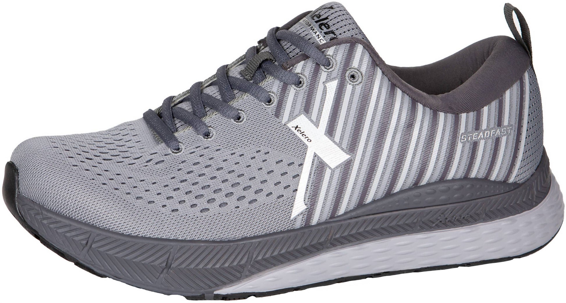 Experience superior support and cushioning with the Xelero Men's Steadfast Walking Shoes in Carbon Grey. Featuring a seamless Fly Knit upper that fits like a sock, these sneakers incorporate Xelero Motion Control Technology to maintain foot alignment and reduce stress during movement. The shoes are equipped with X2 Technology, including a Dynamic Metatarsal Roll Bar for minimizing forefoot flexion, and an EVA midsole providing stable cushioning. Perfect for everyday runs and long walks, these vegan-friendly shoes boast a midsole drop of 11mm and weigh 15oz/430g, ensuring comfort and stability with every step.