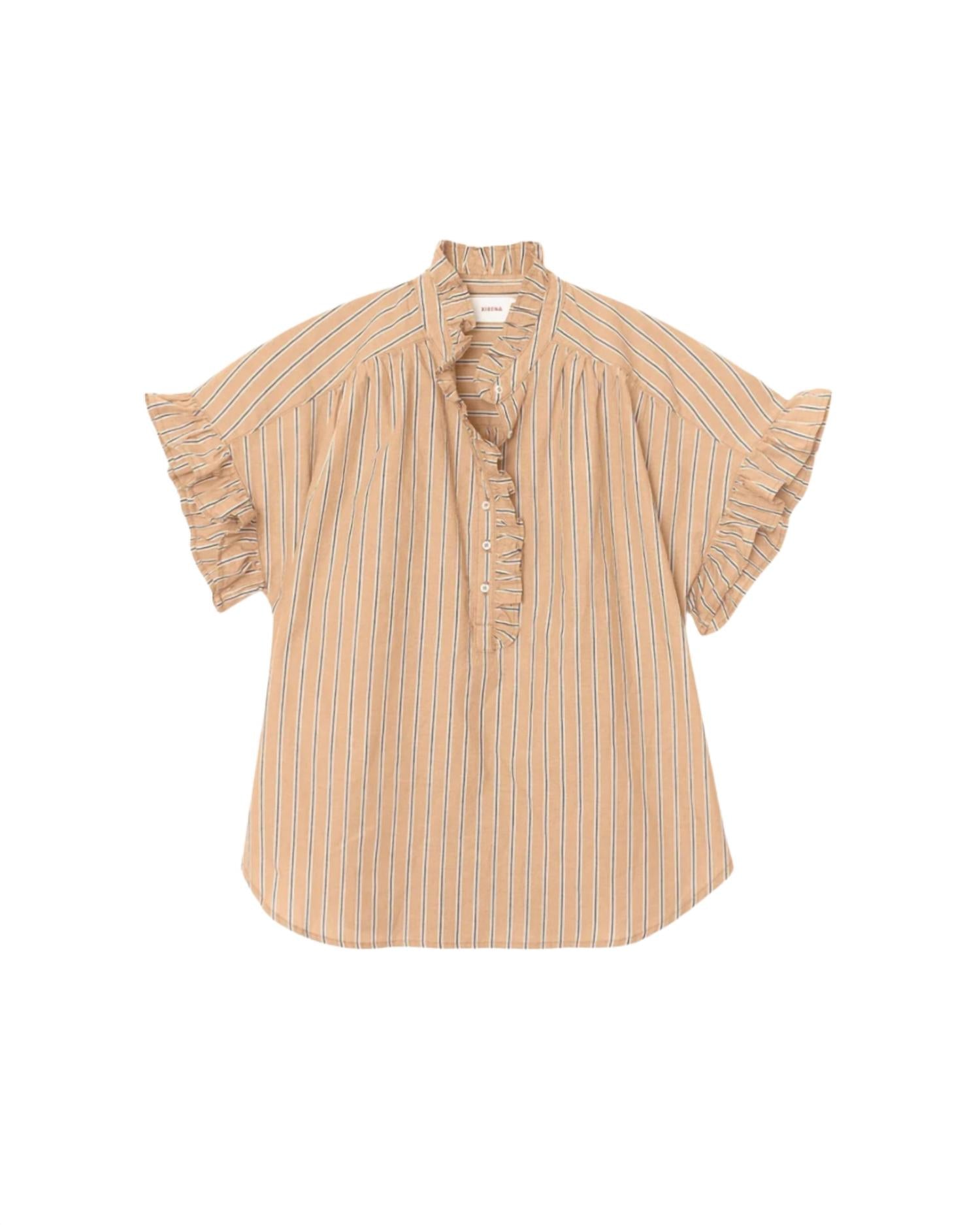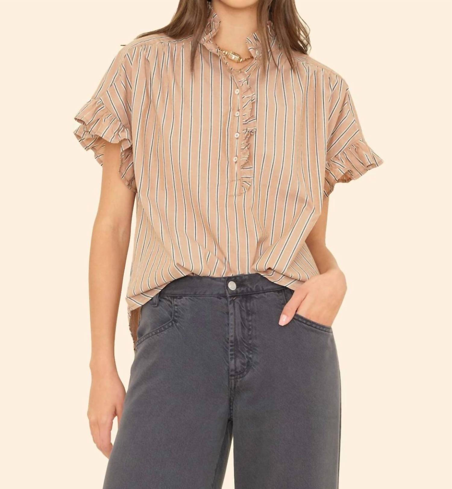 Pair this with your favorite jeans and slides for your next girls night out. The XIRENA Brie Top in Toffee Stripe is a chic addition to any wardrobe with its crisp cotton composition perfect for summer days. Featuring short sleeves, this blouse showcases ruffle details accentuating the collar, front placket, and sleeves for a touch of elegance. It includes a button closure for easy wear and offers practical pocket details. Care for this feminine style is effortless with machine wash and tumble dry instructions.
