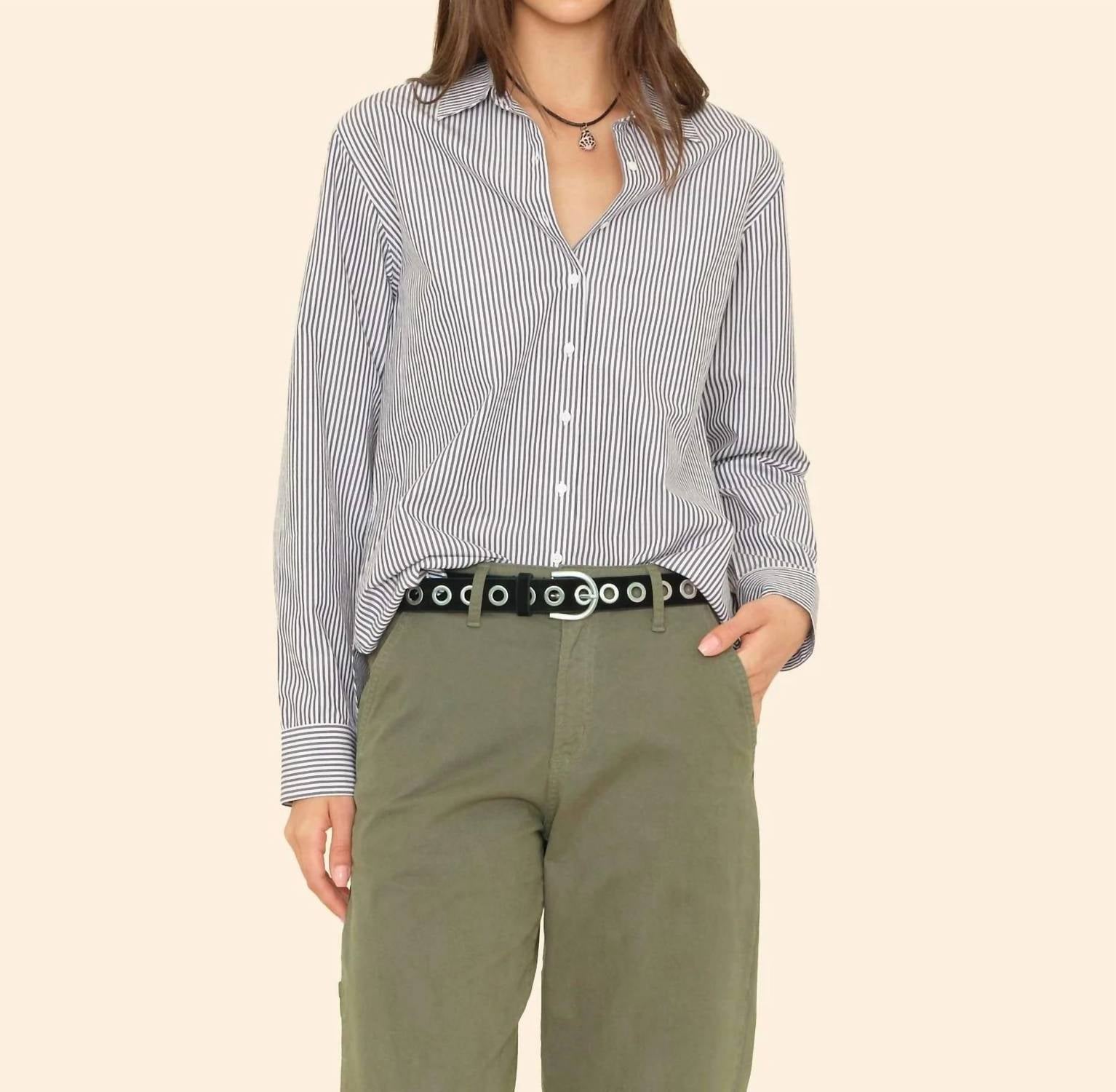 A classic button down shirt that will never go out of style. Introducing the James Shirt by XIRENA, a minimalist stripe-patterned button-down that effortlessly combines style and versatility. This women's shirt in slate black features long sleeves and a pointed collar, accentuated by sharp contrast details for a polished look. Made from 100% cotton, it is designed with a button closure for easy wear. Originating from an unspecified location, this piece is machine washable and can be tumble dried.