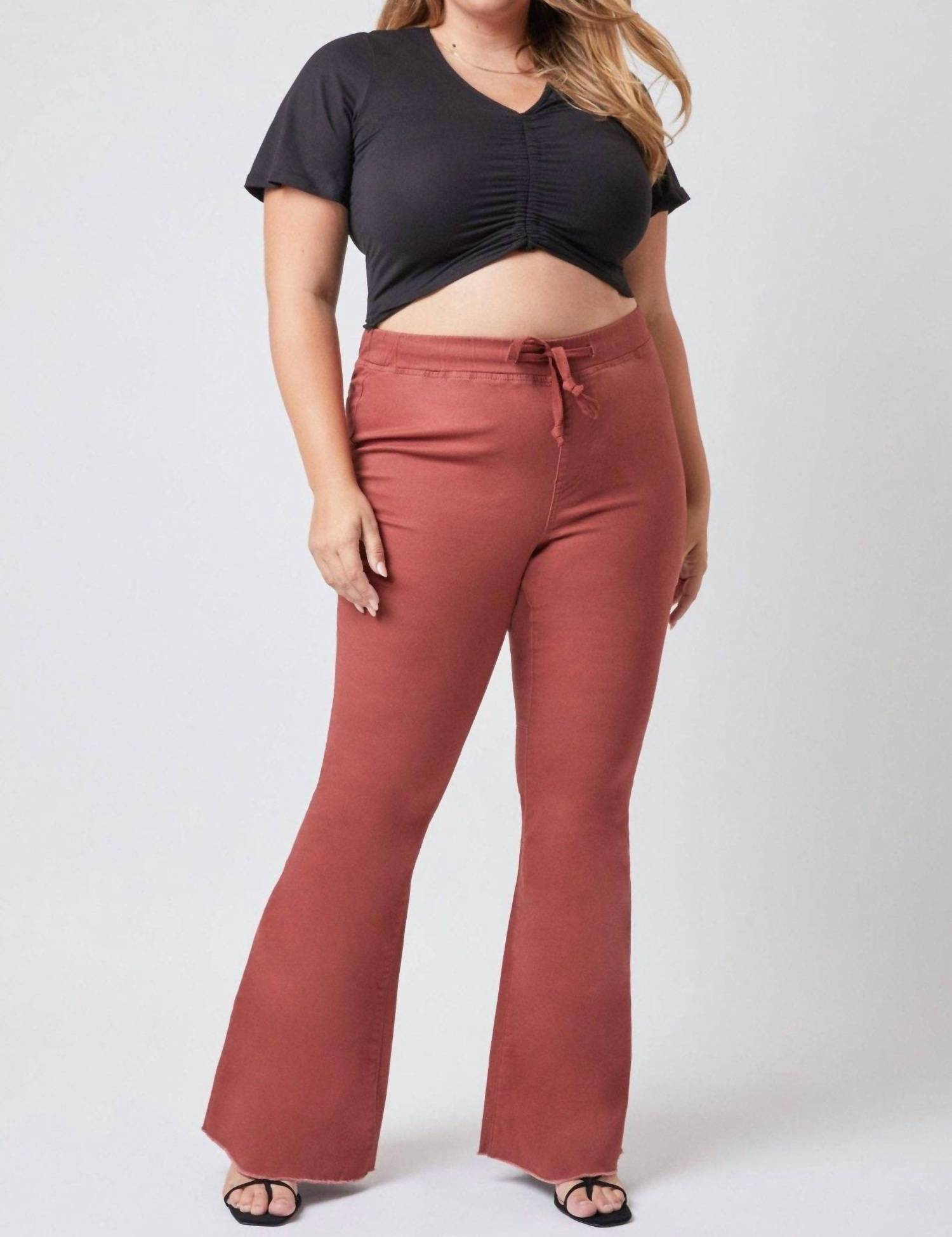 Just as cute as they are comfortable. Meet the Chloe Pull On Fray Flare Jeans by YMI, a must-have for any fall wardrobe in a striking Redwood hue. These high-rise jeans feature a pull-on closure and a comfortable cotton blend composition of 98% Cotton and 2% Spandex. With a stylishly flared leg and raw hem, complete with double back pockets, they offer both flair and functionality. Measurements for size 2X include a 33” inseam, 12” rise, and 28” leg opening. Machine wash cold, tumble dry. Model is wearing a size 1X.