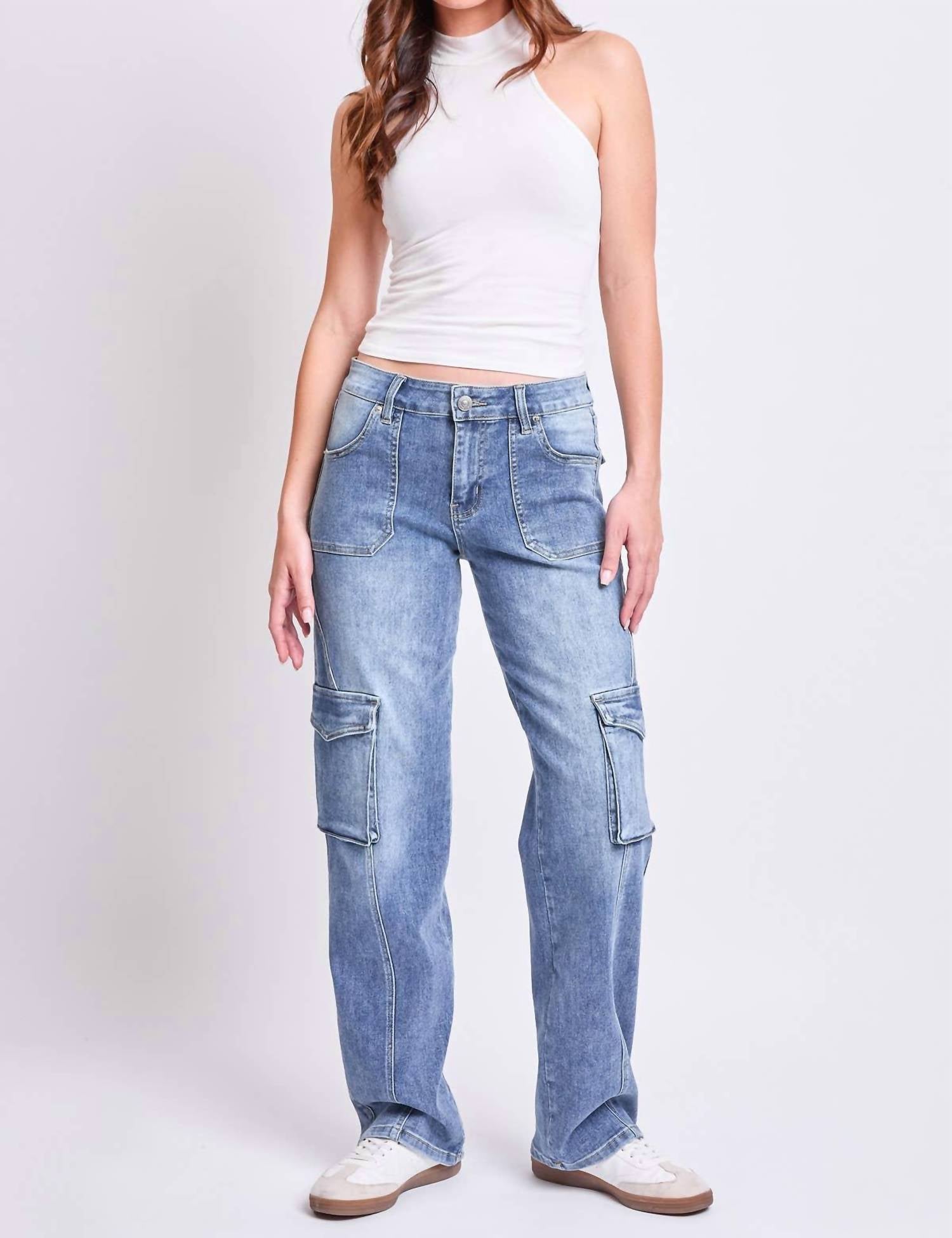 Just as cute as they are comfortable. Discover the Junior High Rise Skater Straight Leg Jeans by YMI, perfect for adding a trendy twist to your streetwear collection. These medium wash jeans feature a high-rise waist with regular fit and a straight leg style, complemented by functional cargo pockets with button closures. These jeans are crafted from a cotton blend consisting of 68% cotton, 27% polyester, 3.5% rayon, and 1.5% spandex for comfort and flexibility. Closure: Zip closure and button fly. Care: Machine wash cold inside out, followed by tumble drying.